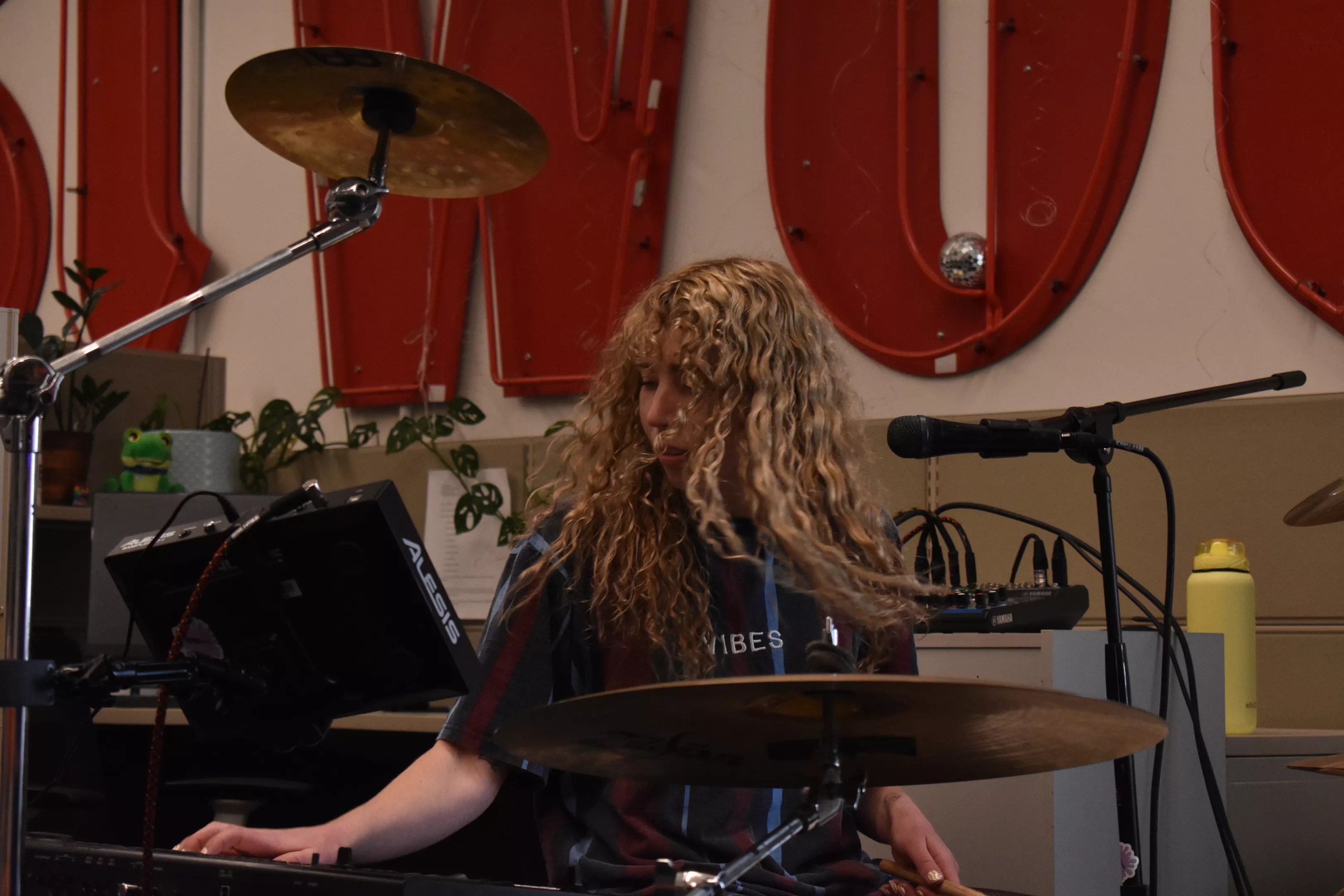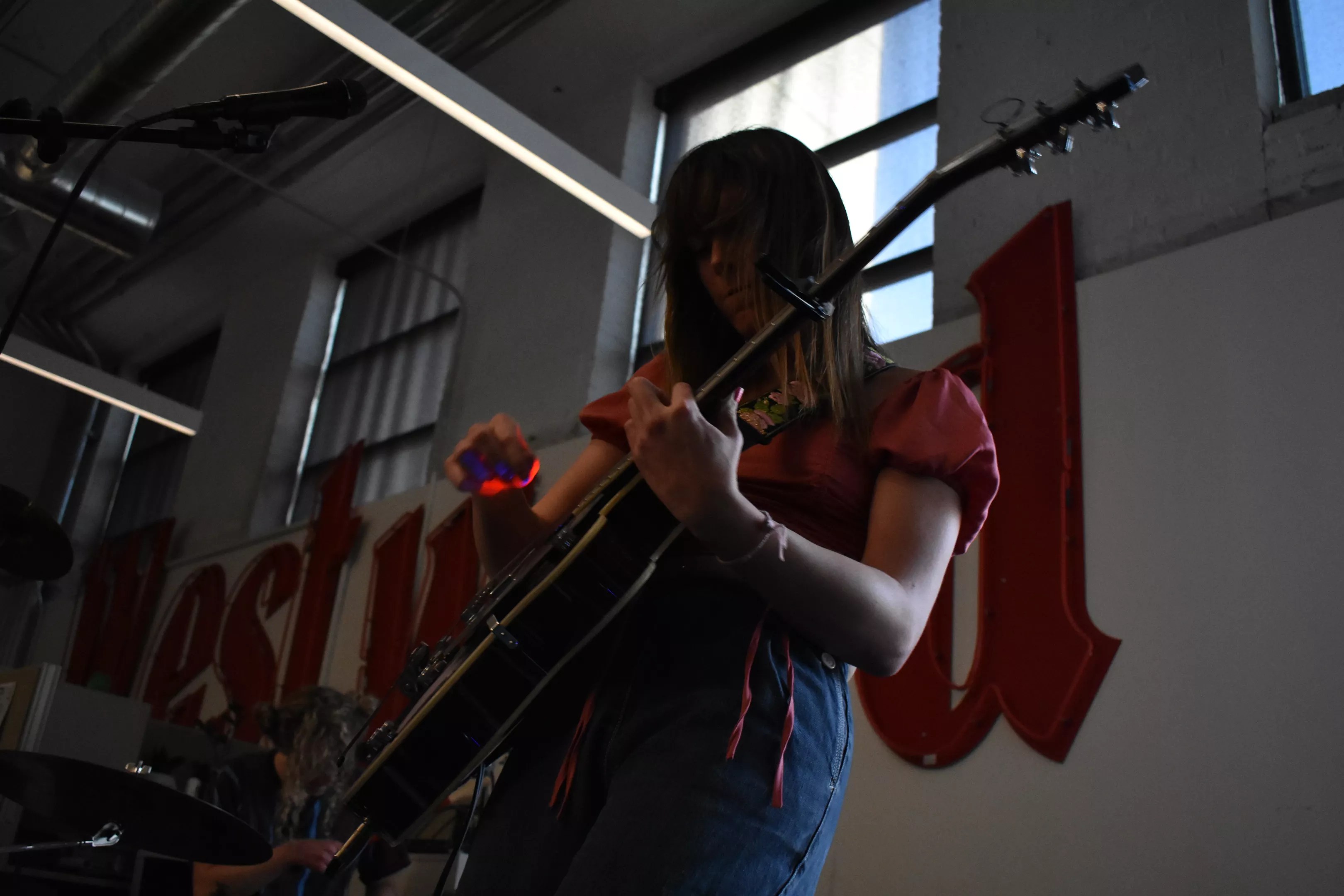Blankslate performed around the editorial desks in front of the Westword sign that used to be outside our old office on Broadway, while members packed the surrounding area. After the concert, I hosted a Q&A with Condron and Dunn, who told us what it’s like being musicians in Denver, discussed touring and talked about their creative songwriting processes. The band is newly a duo (it was previously a trio), with Dunn only recently handling vocals. “It’s been empowering to sing my own lyrics,” she told us. Rylee Dunn’s instrument is both a guitar and a bass. Lillian Fuglei