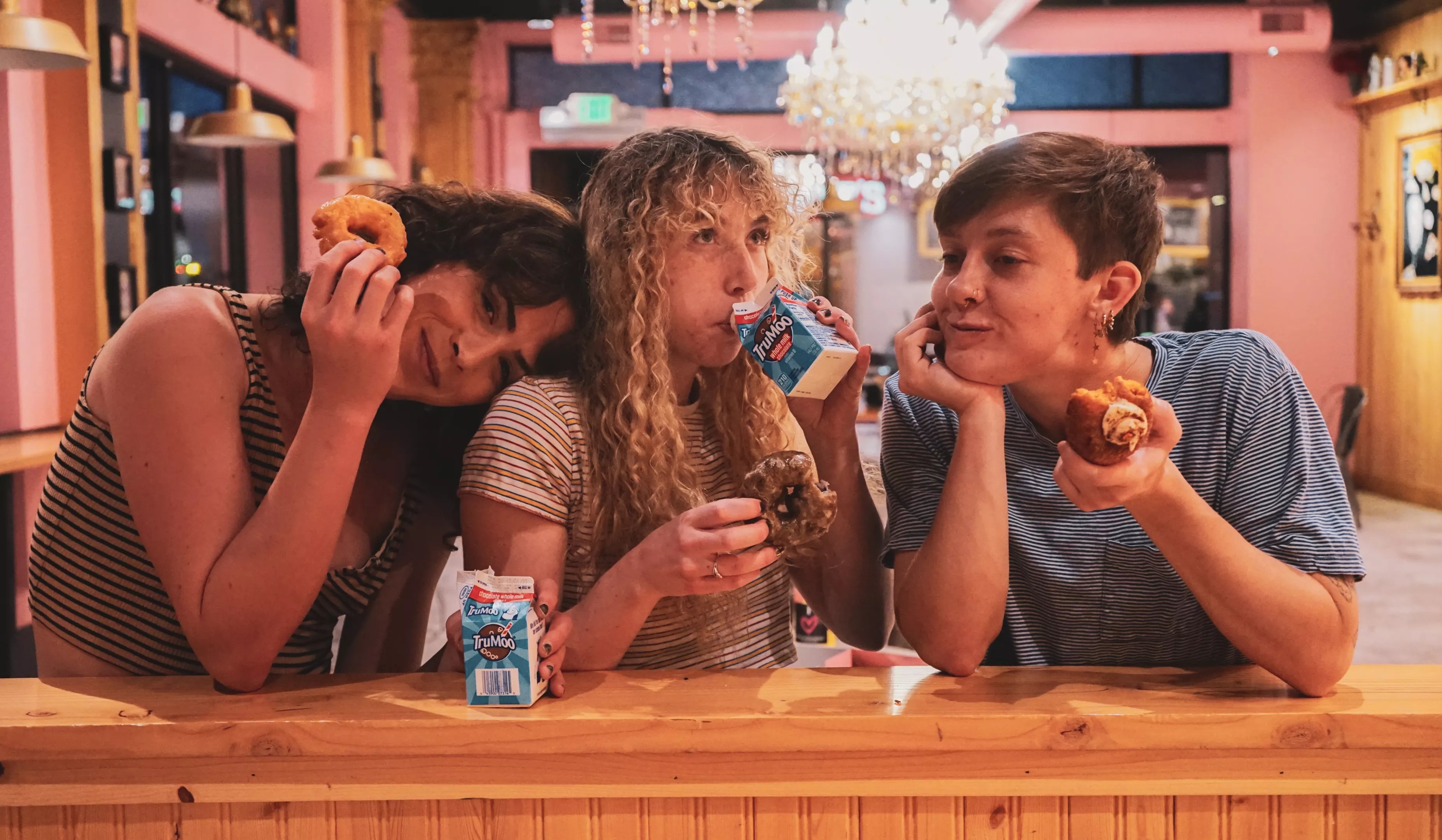 For Condron, being in a band with other queer people has allowed her to break out of her own mold. “Being a girl drummer – which feels so stupid because I’m a drummer, not a ‘girl drummer’ – you’re so boxed into that,” she says. “I’ve been playing drums since I was fourteen, and it felt like my only place would either be in an all-girl band, or as the one girl in a band with a bunch of dudes. I kind of just accepted that as my fate, like I’m either in a token girl band or I’m the token girl member, and that’s all there is to my musicianship. Being able to reclaim the identity of being a woman musician feels really nice.”
