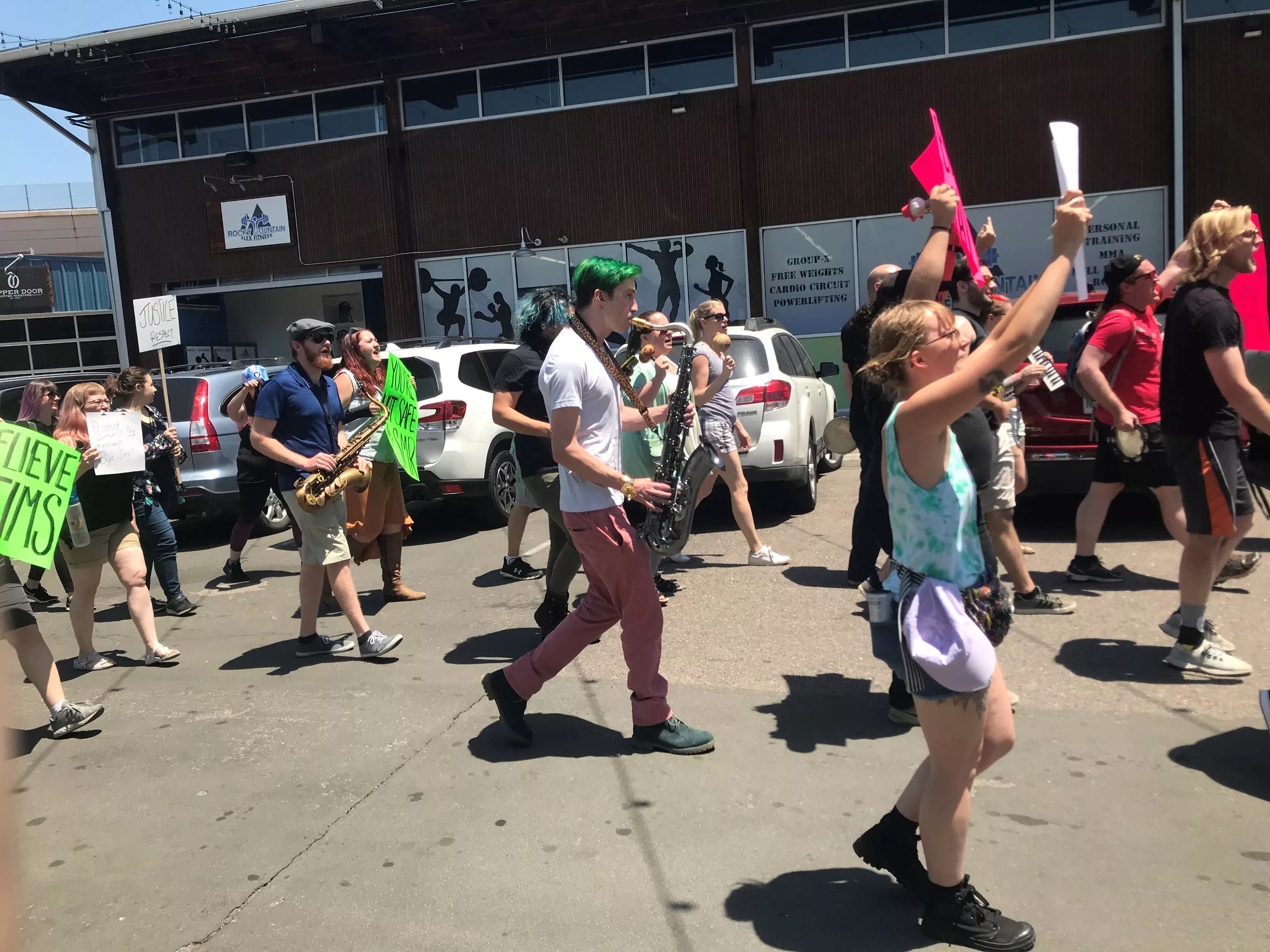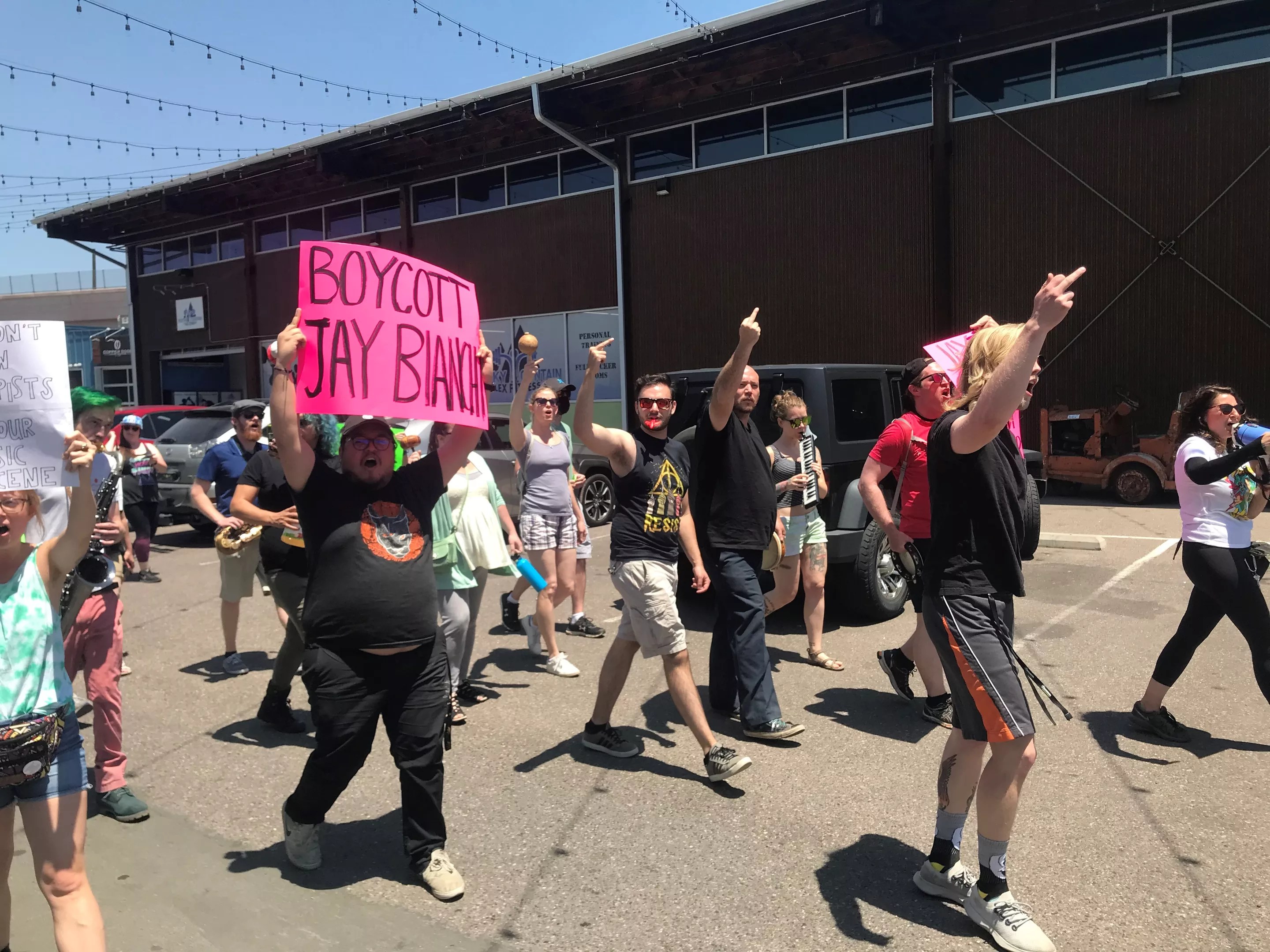 The Colorado Musicians Union marches toward So Many Roads Museum & Brewery, protesting Jay Bianchi.