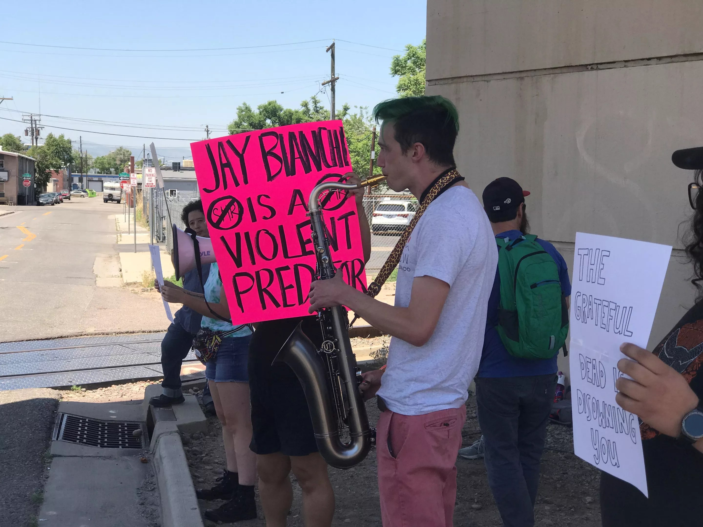 A protester plays saxophone as fellow musicians chant against Jay Bianchi.