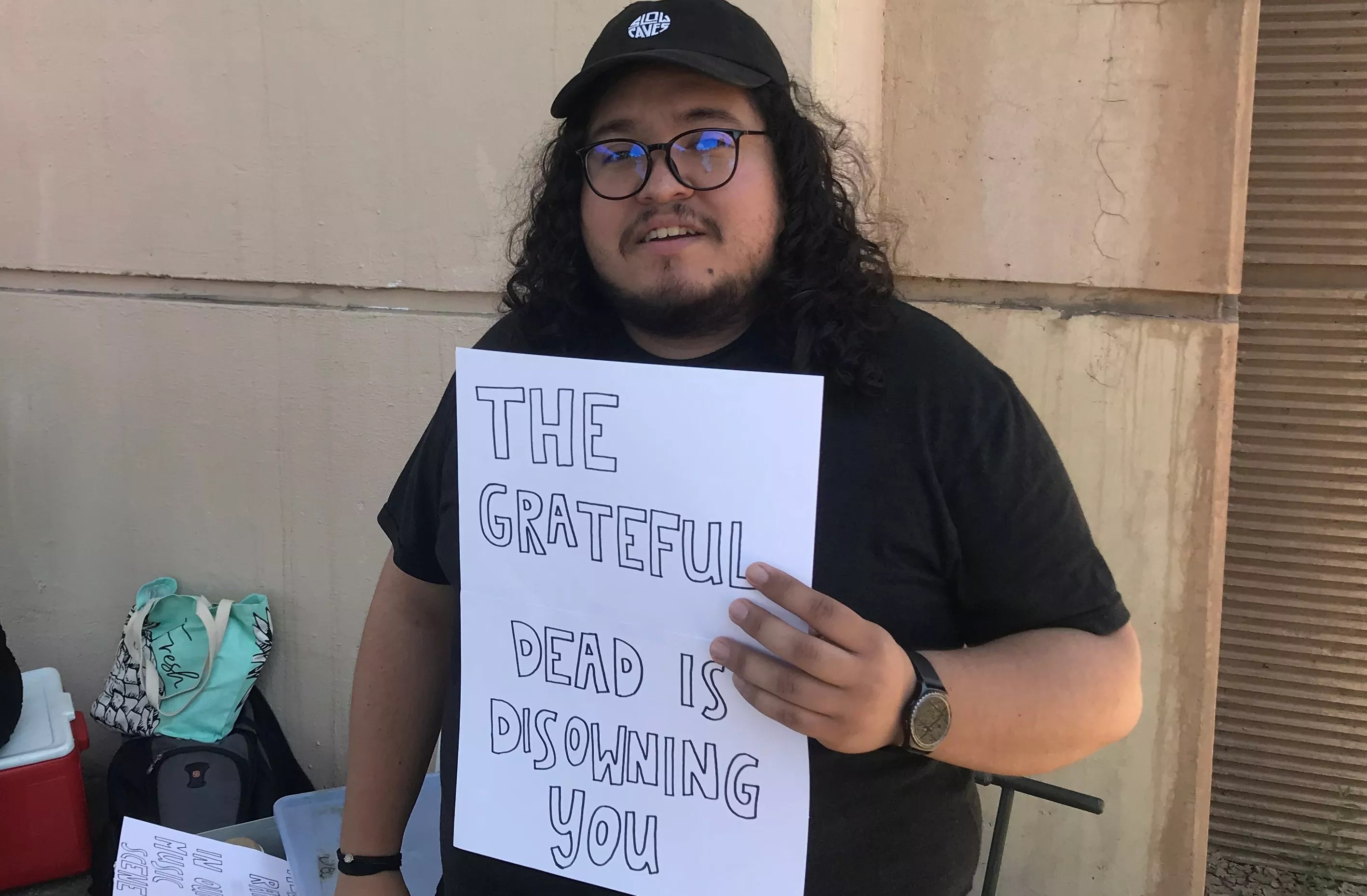 Church musician Jorge Palacios holds a sign: “The Grateful Dead Is Disowning You.”