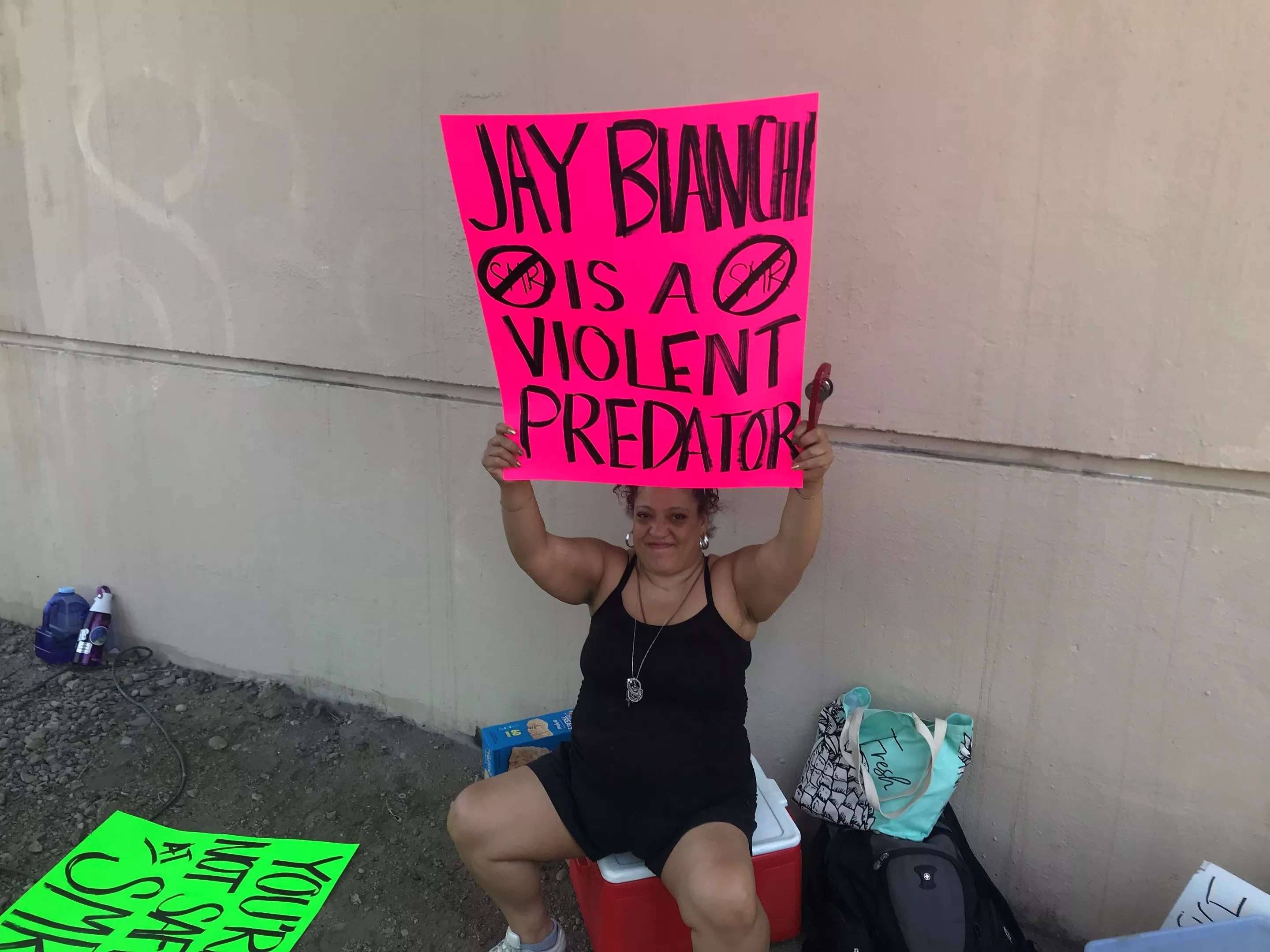 Devora “Cat” Lilly Rainbow holds a sign that states: “Jay Bianchi is a violent sexual predator.”