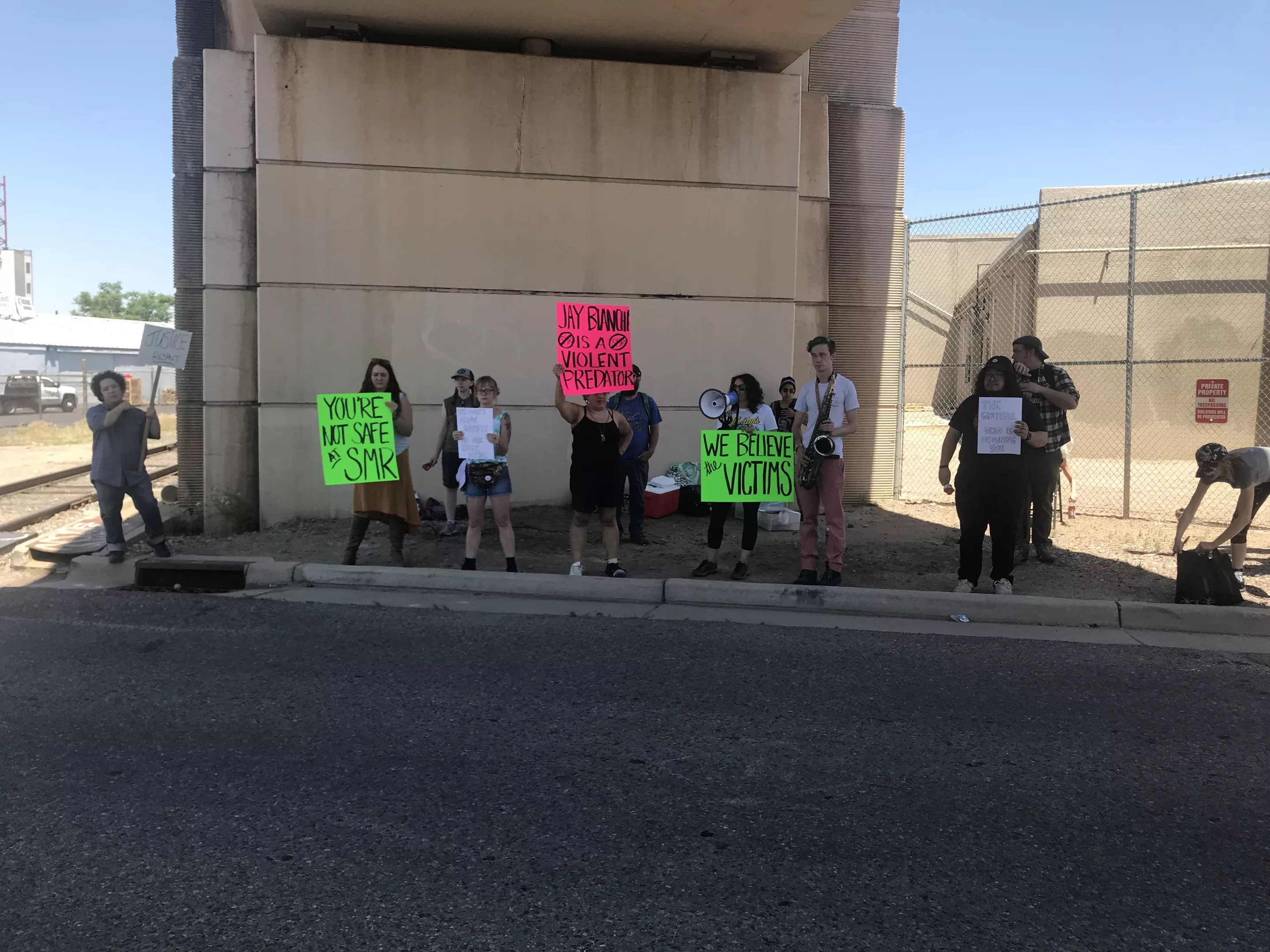 The Colorado Musicians Union pickets So Many Roads Breweries, with signs that state: “You’re Not Safe at SMR,” “Jay Bianchi Is a Sexual Predator,” and “We Believe the Victims.”