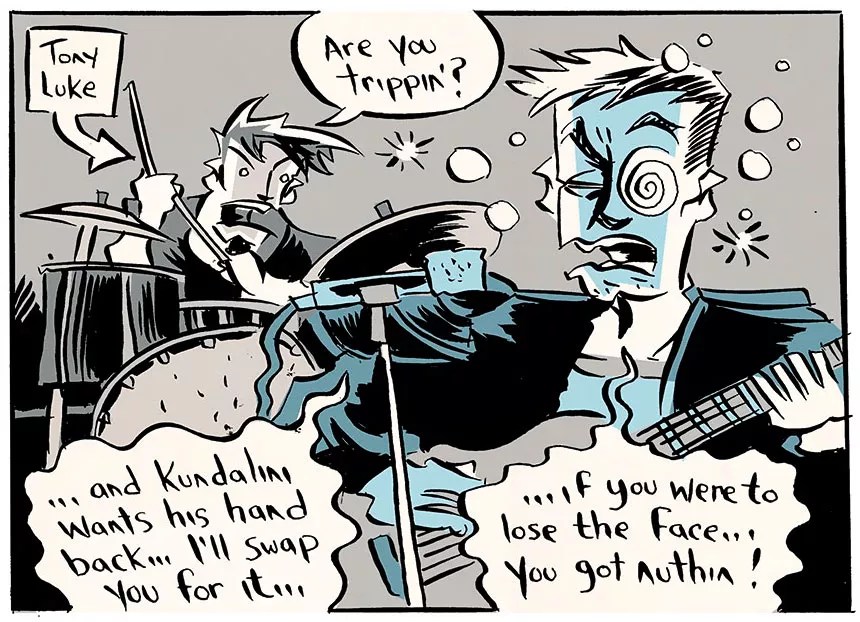 We’d been writing songs and practicing in a dingy basement for a few months but had no gig mojo yet. Drummer Tony Luke and I were getting ready to go to a party when he got a call. I took a hit of acid and continued assembling my Mad Max costume. Tony came back excited: A band had canceled, so our first gig was that night. This was our chance. I wondered if I should puke up the LSD…but the hell with it. Let’s do this! Karl Christian Krumpholz
