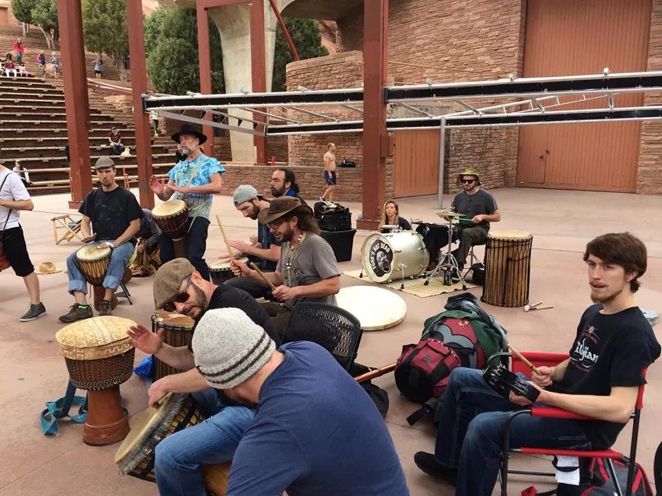 The drummers who participate in Denver Drum and Dance‘s weekly drum circle typically gather at Denver Art Society on Sunday evenings. But for April, they have been spending Sunday afternoons drumming on the Red Rocks Amphitheatre stage.