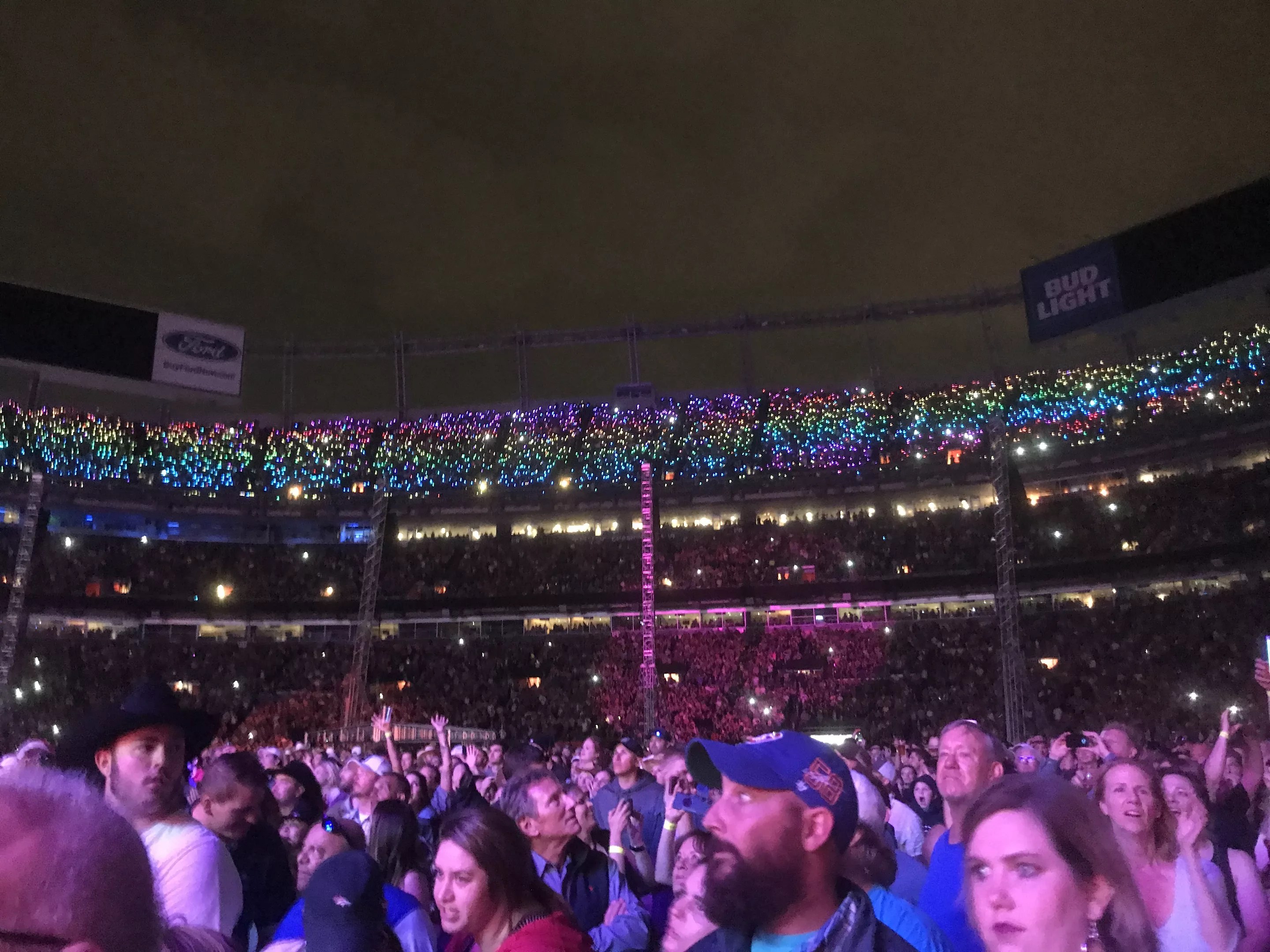 A rainbow flag created a halo over the crowd at the Garth Brooks concert on June 8, 2019 at Broncos Stadium.