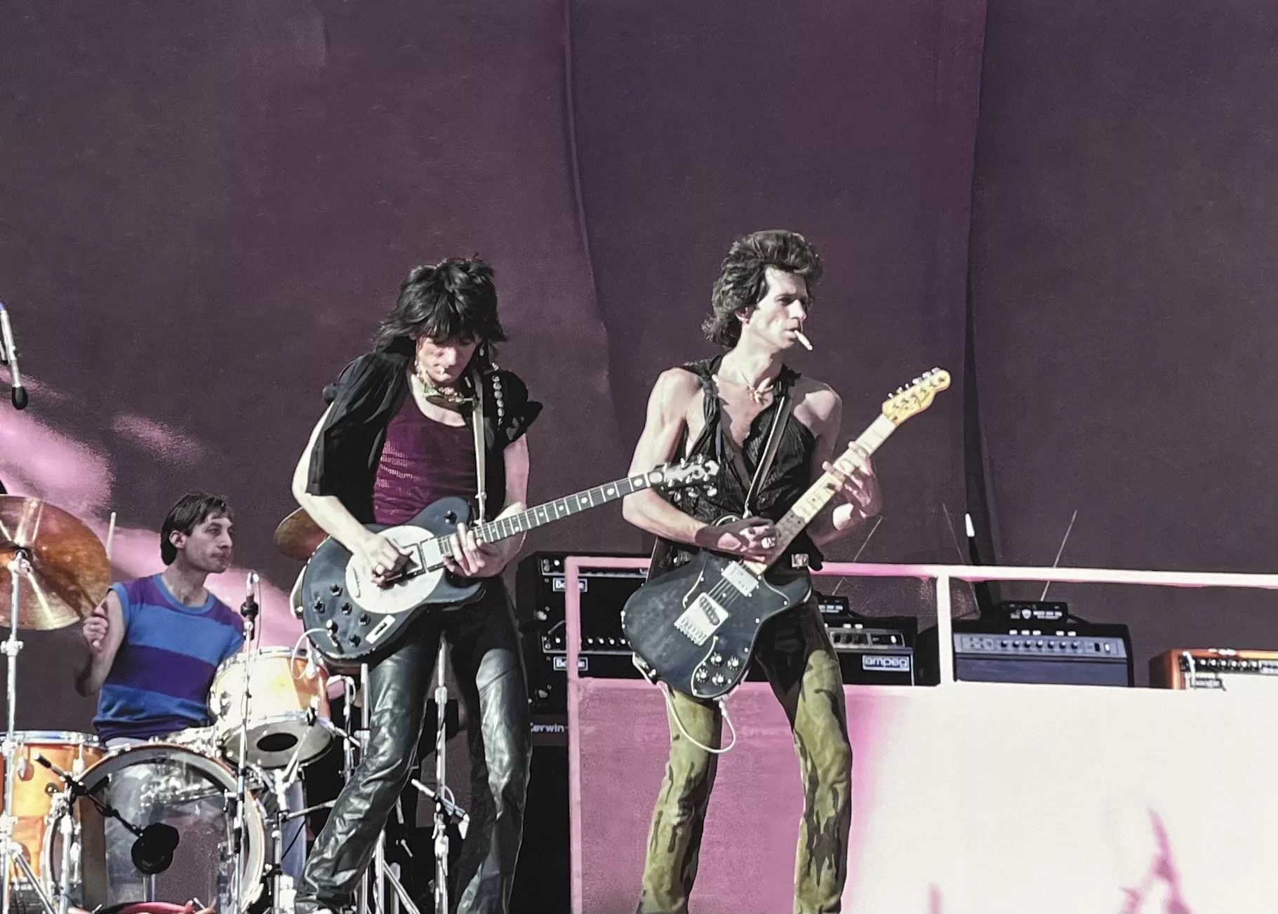 Even so, Perea managed to get within fifteen feet of the stage. “Mick came out and everyone started pushing forward. I had to wait for the proper moment he was in front of me to take the good shots,” he says. “I remember at one point he looked right down my lens, and I have that picture in this exhibit. Then I would focus on Ronnie Wood, follow him around for one or two songs to try and capture some good action, and the same with Keith – all the while I’m being shoved around with hands up in my face to where I couldn’t take any photos at certain times.
