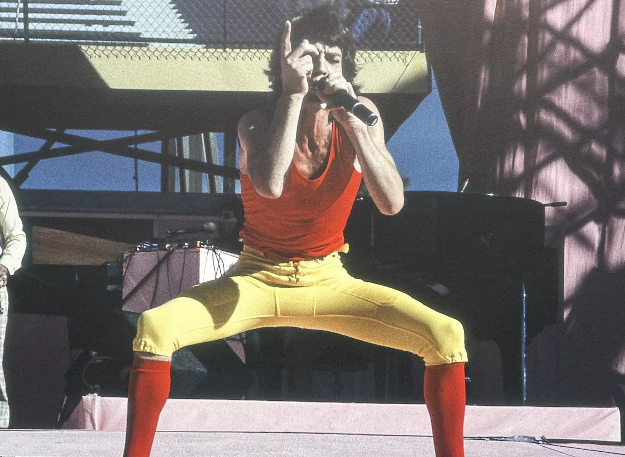 The photographs depict the spirited, high-octane energy of the Rolling Stones. One particularly captivating image shows Jagger in the center looking like an off-duty Ronald McDonald in a bright red tank, matching knee-high socks and yellow baseball pants, singing into the mic as Richards and Wood make eye contact behind him, bowing over their instruments. It’s almost as if you can hear the blare of an amp from the photo. Other images give the impression that Jagger was intentionally modeling for them; in one, the singer has his right arm angled high, with the mic pointing directly down towards his head. His eyes are closed, lost in a dance, and his left arm is mid-way through a sweeping motion, his fingers artfully splayed.