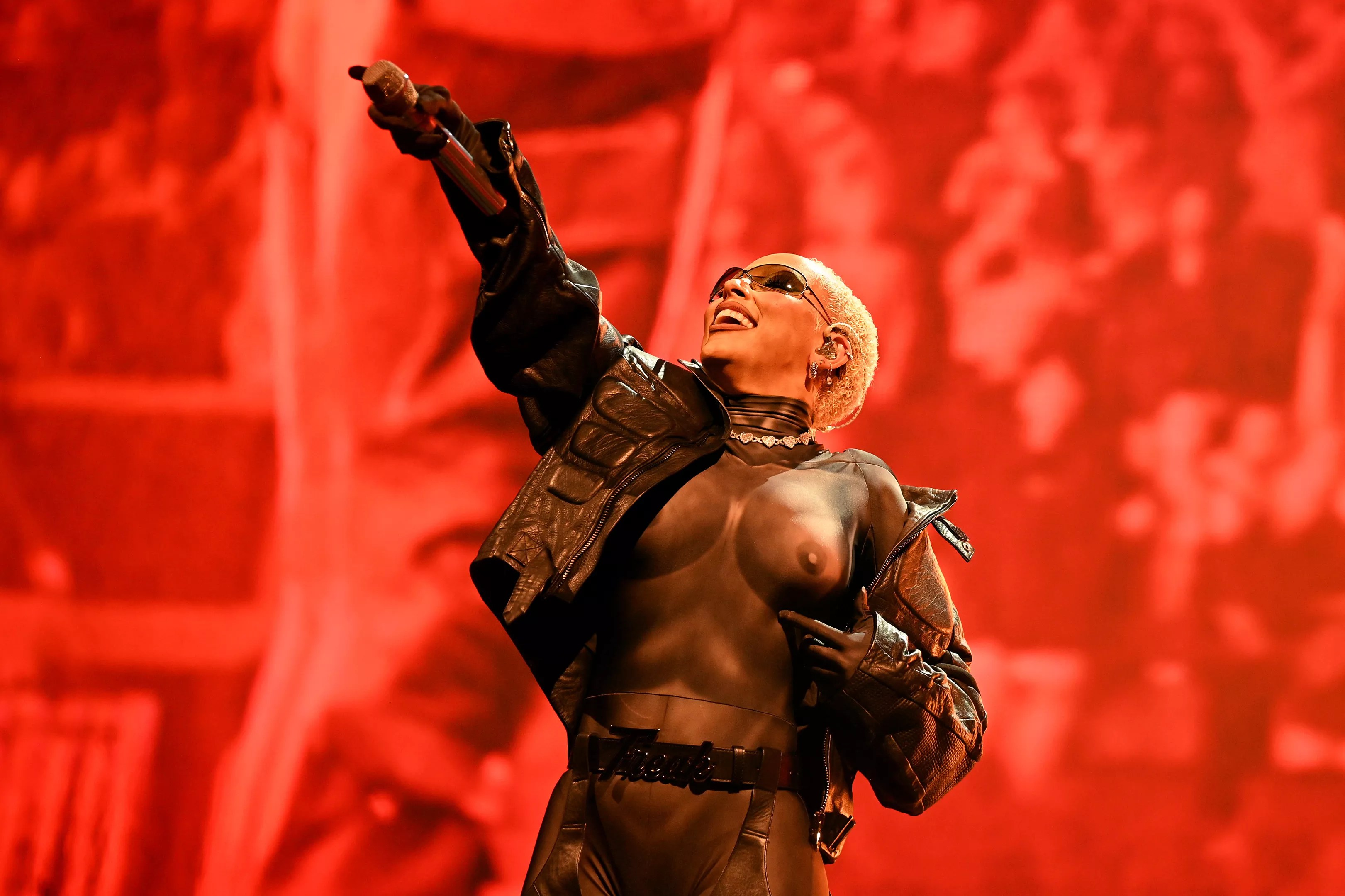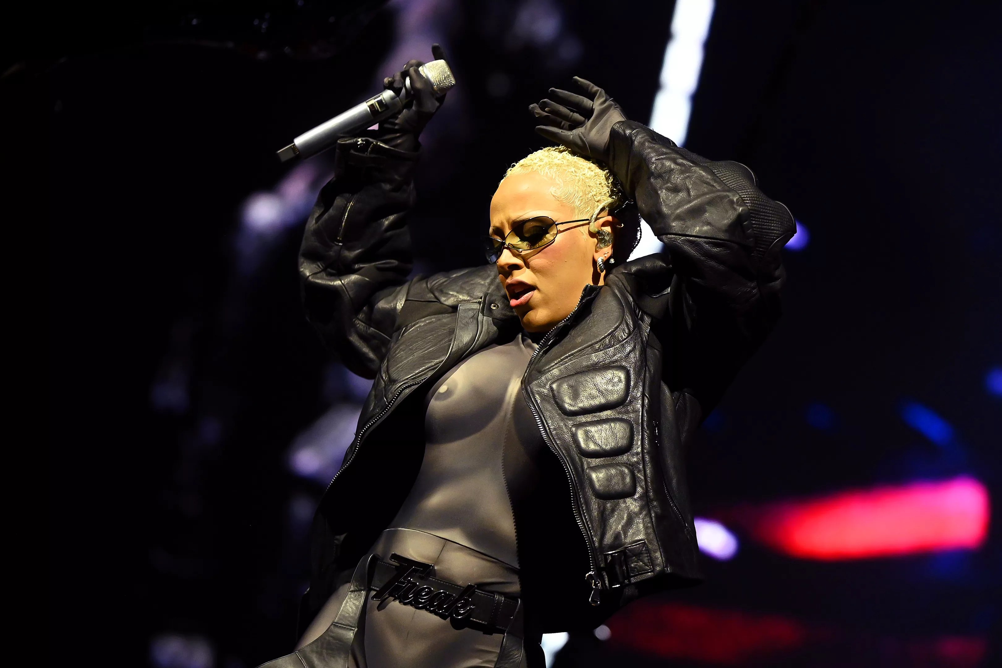And Doja herself donned a new tour outfit – a white corset top, white thong and white arm warmers, with dramatic splashes of fake blood dripping down her legs and arms and bloody handprints cupping her chest. She started the show wearing red, rectangular glasses (which were quickly ditched), and her makeup was relatively simple – dramatic winged eyeliner, heavy blush and yellow eyeshadow beneath thin, drawn-on brows.