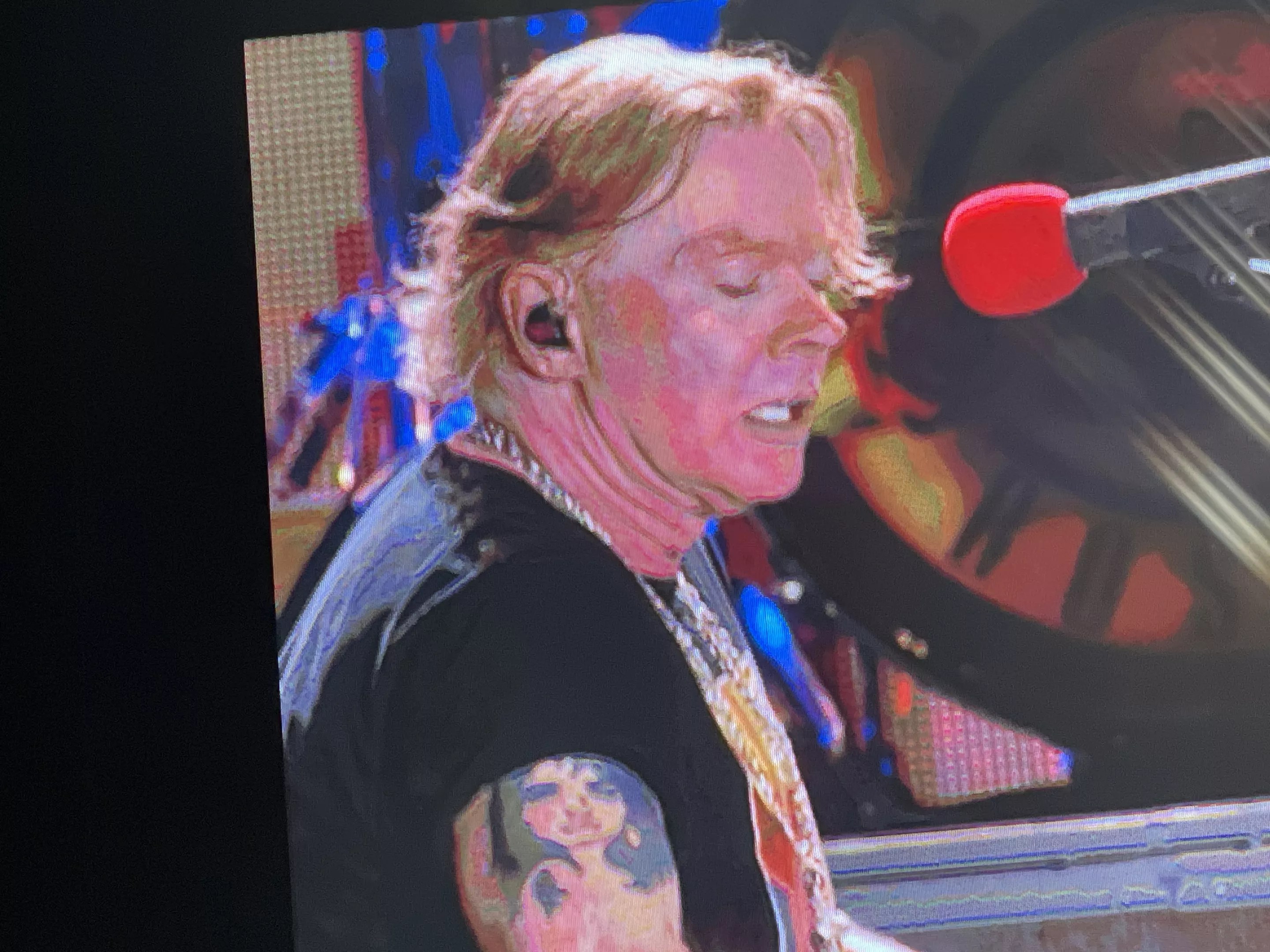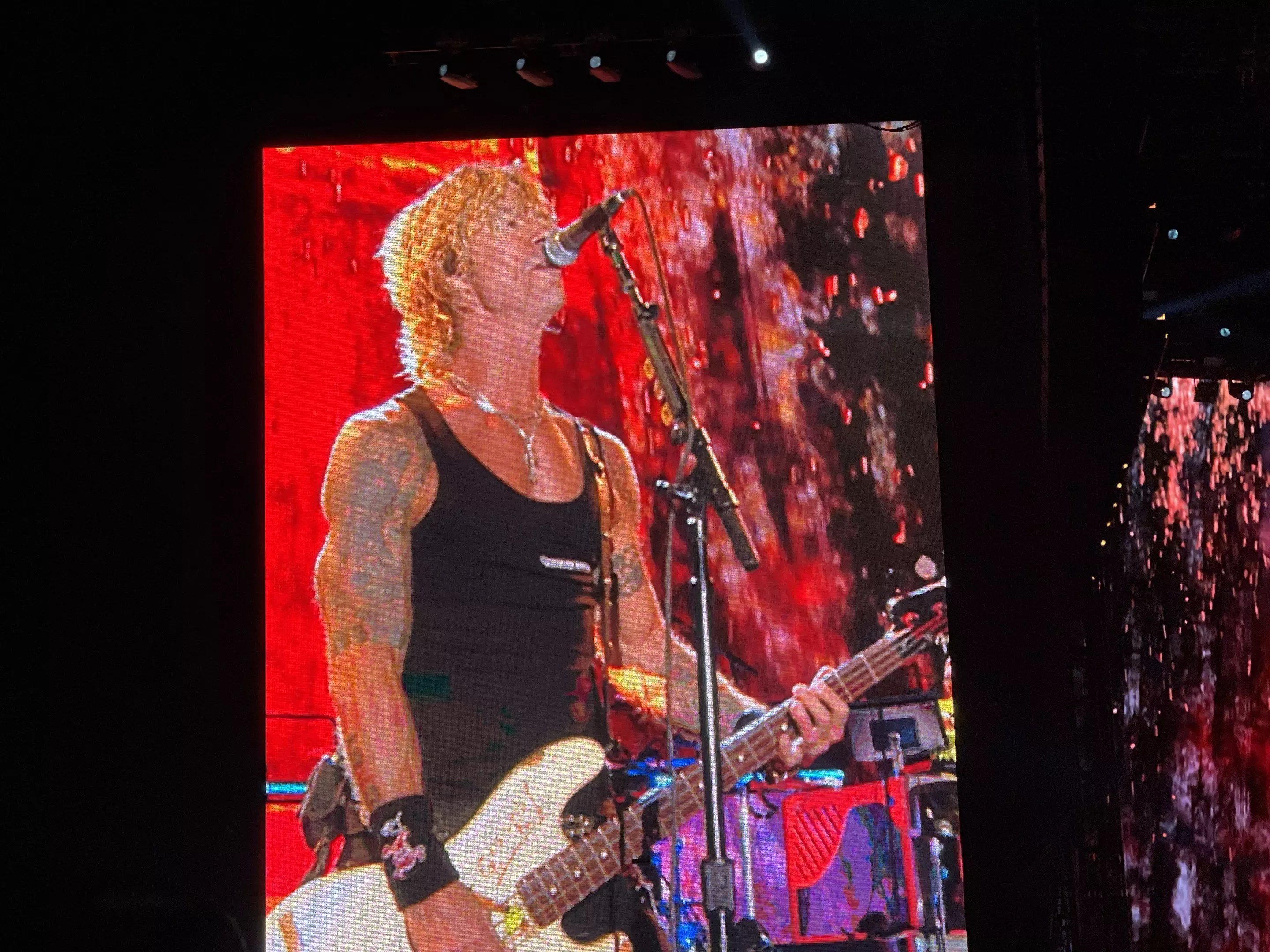 The kid in front me at the show, probably still in elementary school, couldn’t get enough. Though it was the night before his first day of classes, he was standing on his seat, swaying his arms, banging his head and shooting the sign of the horns. Hail Satan, he grinned. He mugged for a photo with middle fingers drawn toward his mom’s smartphone and then made friends with a group of stoned, drunk adults who were wearing headbands in honor of Axl Rose. The five of them partied together till the adults left (to avoid parking-lot gridlock) and the kid, worn out, slumped in his seat as Rose crooned “Patience” and “Paradise City” for the encore. That child wasn’t the only die-hard fan tuckered out – but the band raged till the end.