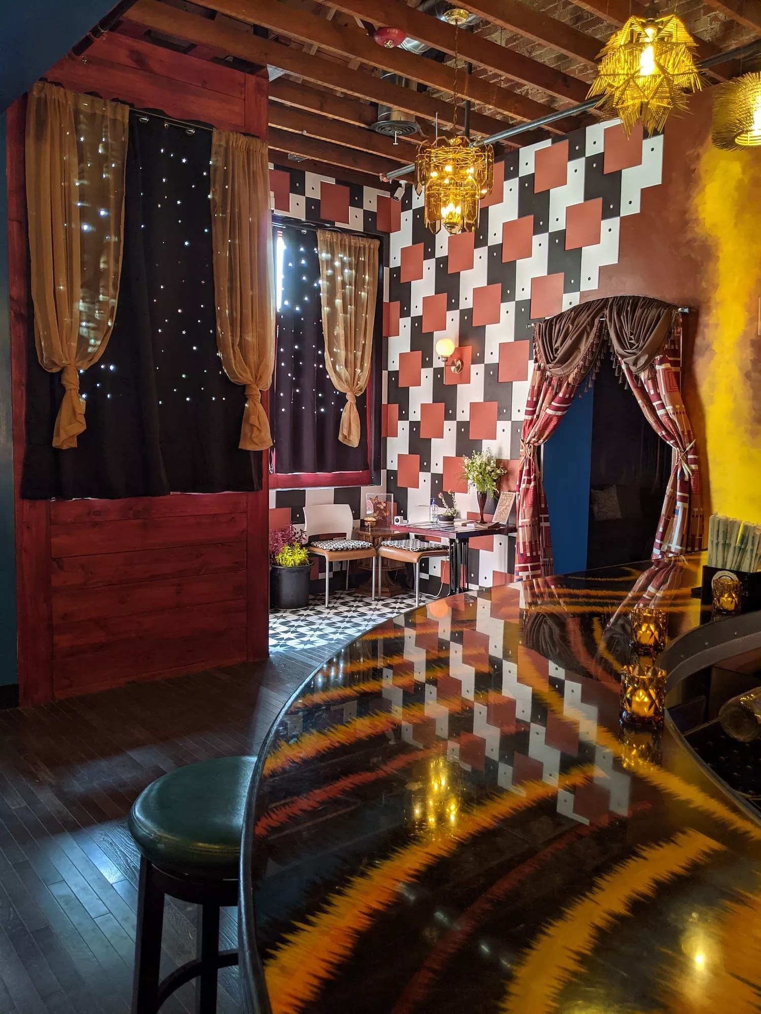 Enigma Bazaar, a “mystical bar and arts venue” that opened last fall in Berkeley, was the perfect spot for Santana to bring his vision to life. Welcoming artists of all mediums, Enigma Bazaar frequently hosts open-stage nights, open-mic nights, drag shows, comedy shows and even opera singers and tarot readings. Santana found the eclectic venue through his friend Kevin Hernandez, a photographer who goes by the name L8gacy (and who will handle the photography and videography at Bars at Bazaar).