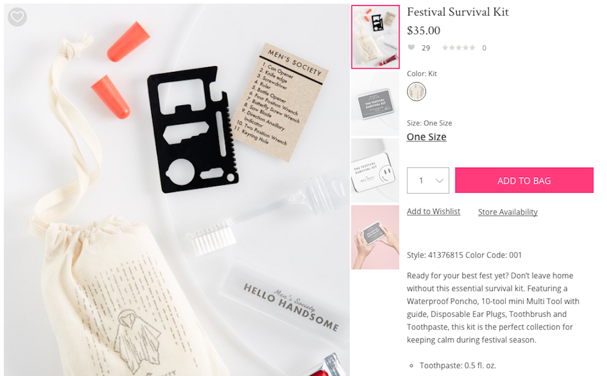 Also, can we please take a moment to acknowledge the ridiculousness of Free People’s $35 Festival Survival Kit – a bag with a plastic poncho, earplugs, toothpaste and a “multitool” that is basically a bottle opener? (The kit, by the way, is marketed in the “Men’s Society” line – presumably because it includes a sharp object.)
