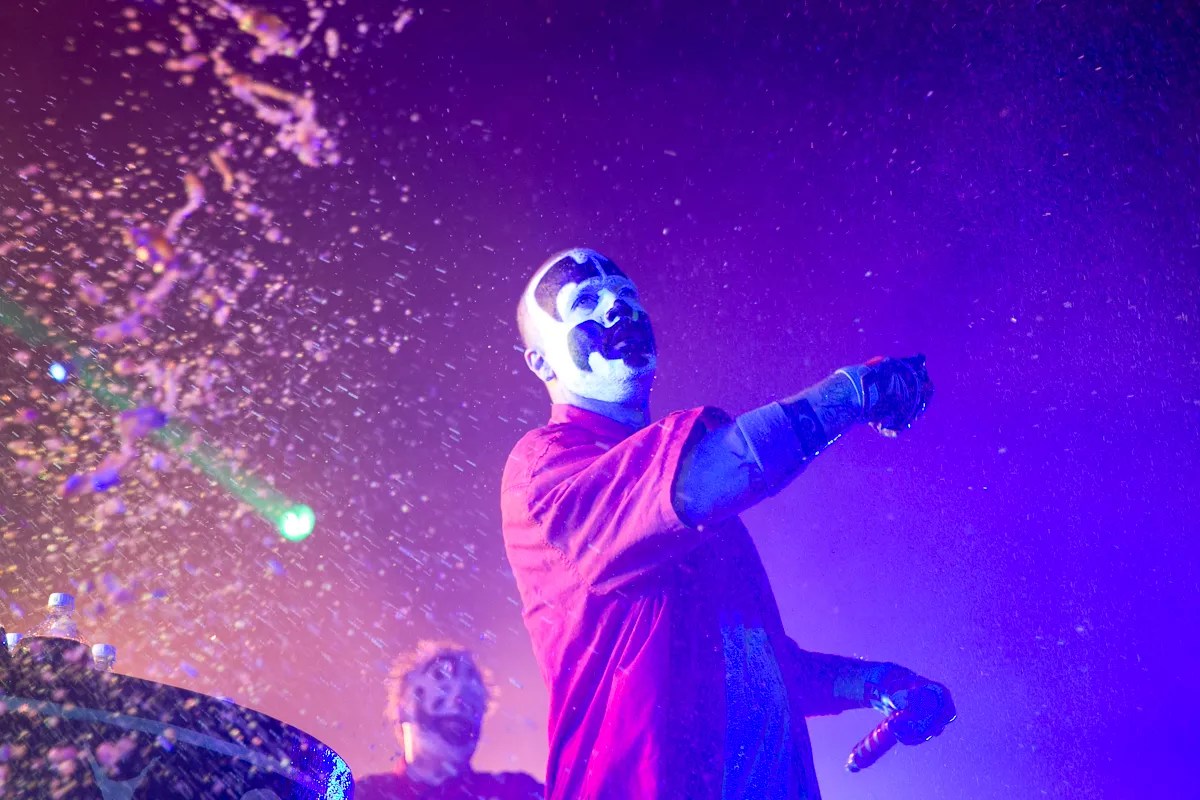 Toward the end of the show, the VIPs were invited to the back again. I feared the rest of us would get stuck waiting out an endless pre-encore meet-and-greet. But they joined ICP on stage, armed with two-liters of Faygo. They started spraying the crowd. The soda lit up underneath strobes, looking ghostly, like floating plasma.