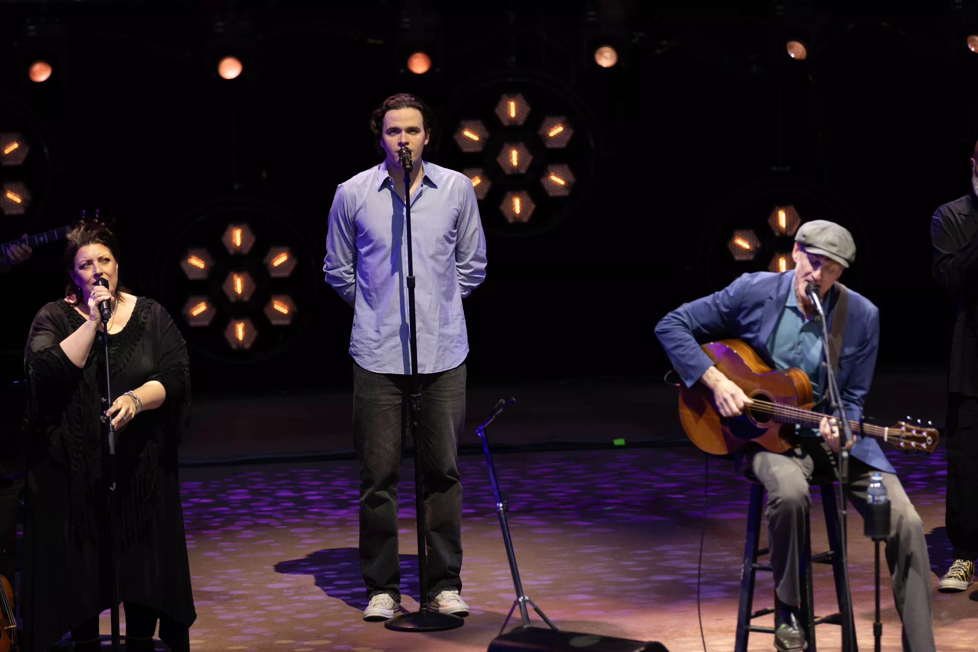 Andrea Zonn (left) is a longtime backup singer and fiddler for Taylor. Henry Taylor (center), James’s son, is also one of his backup singers.