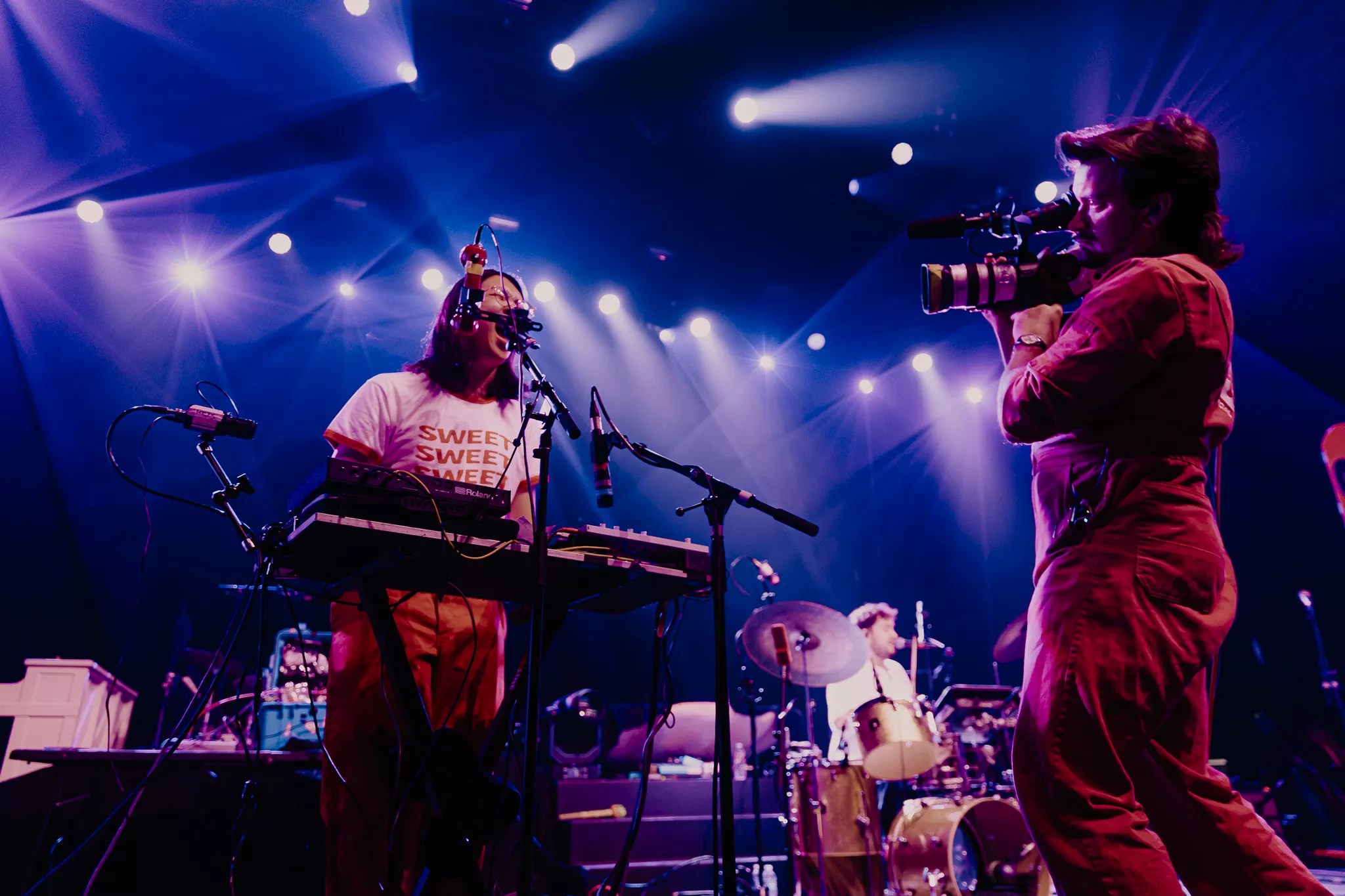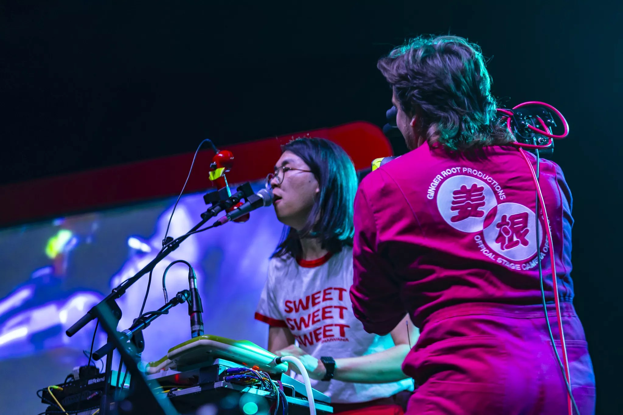 California indie-pop project Ginger Root opened the night with a multimedia set accentuated by two giant television screens on either side of the stage, and a videographer “performing” live shots alongside the band. The self-proclaimed “aggressive elevator soul” project dipped in and out of funky retro grooves and short cut scenes on the screens, with vocalist Cameron Lew setting the tone for what would become a lively, danceable evening.