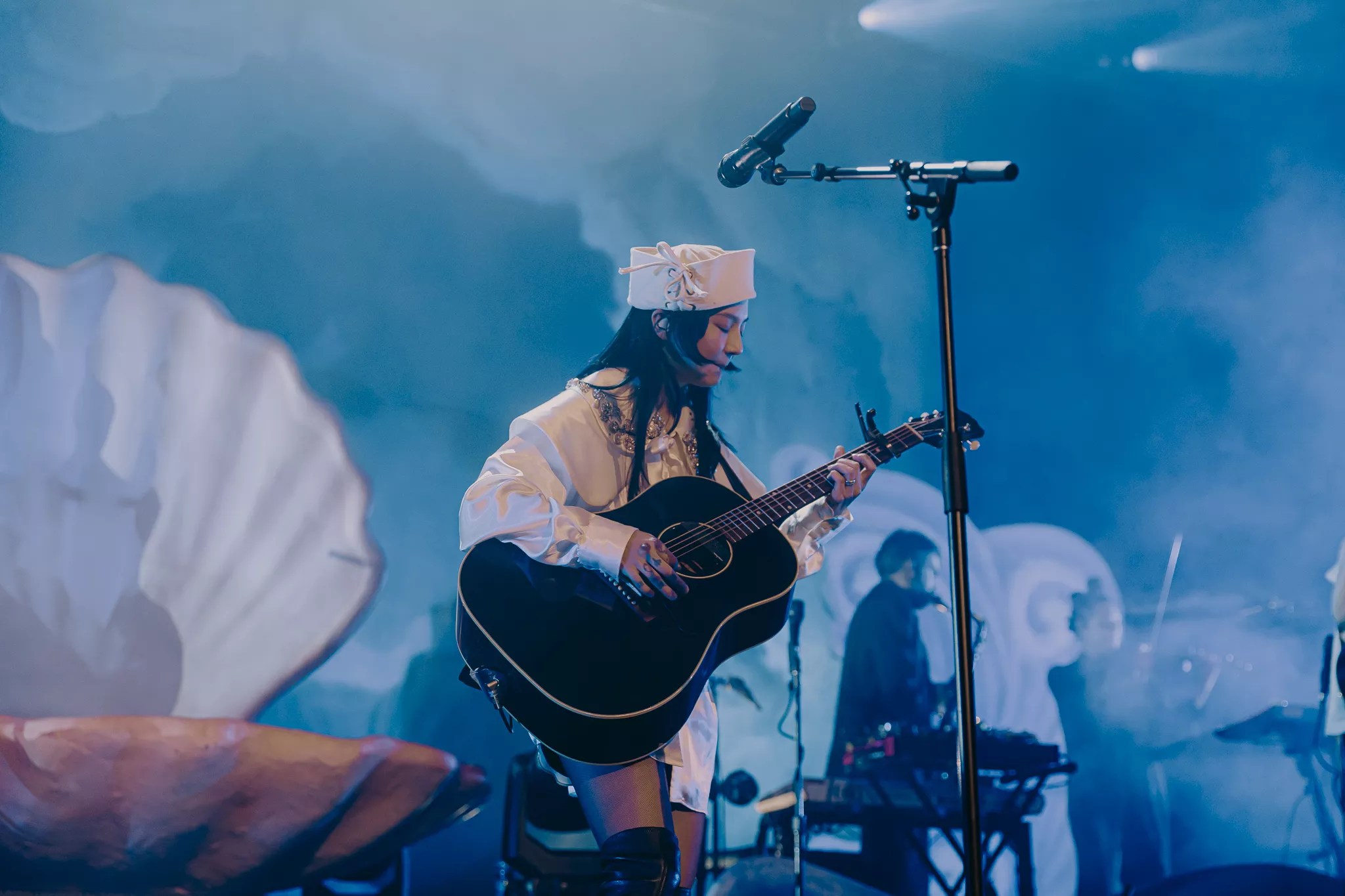 After a short break, Japanese Breakfast took the stage to a dreamy string intro in mostly total darkness, save for a lantern carried by Zauner. The nautical stage called back to the birth of the goddess Venus, with a giant pink clam in the center and large stage props painted to look like waves crashing around the outskirts of the stage, all in front of a massive, cloud-painted backdrop. As Zauner waltzed to perch on the front of the clam, the band opened with an impassioned live version of Melancholy opener, “Here is Someone.”