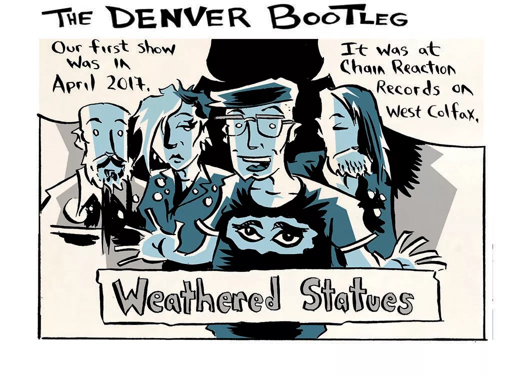 Jason Heller: “Your first show with your new band is a whole lot easier when it’s with old friends. Josh and Justin Lent, who run Chain Reaction Records, are fellow veterans of the ’90s punk scene in Denver. I’d also played in bands with all three of my Weathered Statues bandmates: in Hyacinth with our singer, Jennie Mather; in Red Cloud West with our drummer, Andrew Warner; and in 25 Rifles with our bassist, Bryan Flanagan. To make it even more of a family affair, I used to play in a punk band called Crestfallen with John Mather, Jennie’s husband. Karl Christian Krumpholz