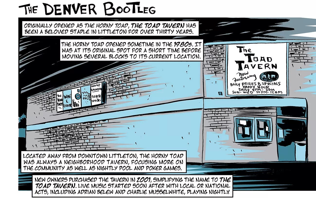 Editor’s Note: The Denver Bootleg is a series chronicling the history of local music venues by longtime Denver cartoonist Karl Christian Krumpholz. Visit Krumpholz’s website to see more of his work.
