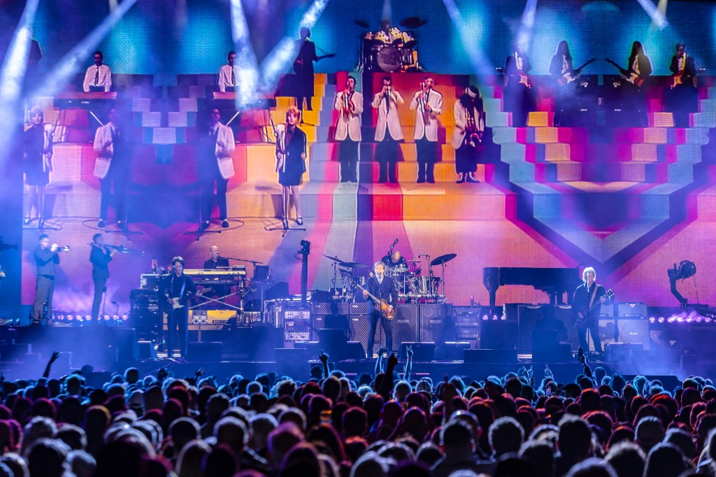 But it wasn’t long before the band was back on stage, returning with flags in hand: McCartney holding an American flag, while British and Pride flags were waved by his bandmates. The encore completely comprised Beatles songs: “I’ve Got a Feeling,” “Sgt. Pepper’s Lonely Hearts Club Band,” “Helter Skelter,” “Golden Slumbers” and “Carry That Weight.” And it all finished with a crescendo in the most appropriate song possible: “The End.”