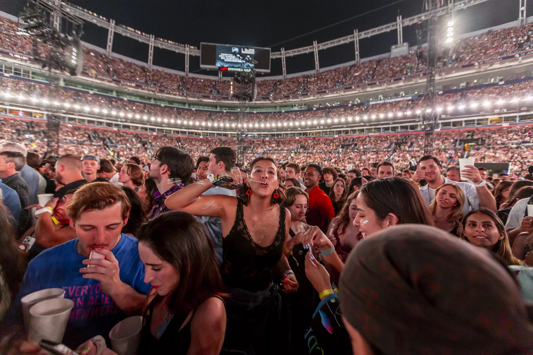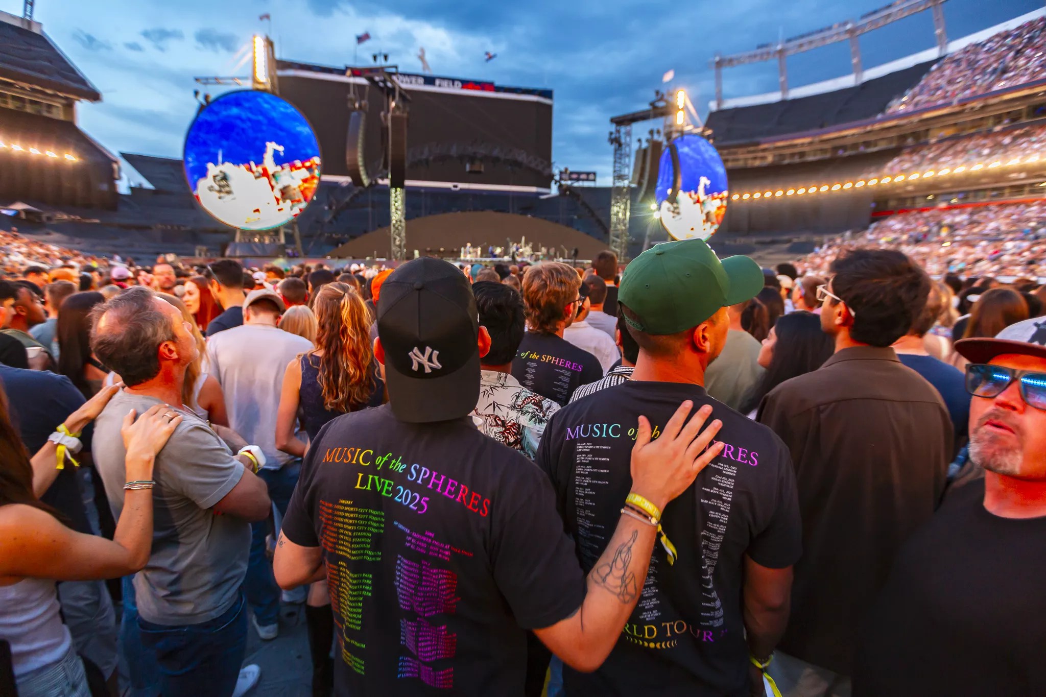 Coldplay fans wearing artist merch.