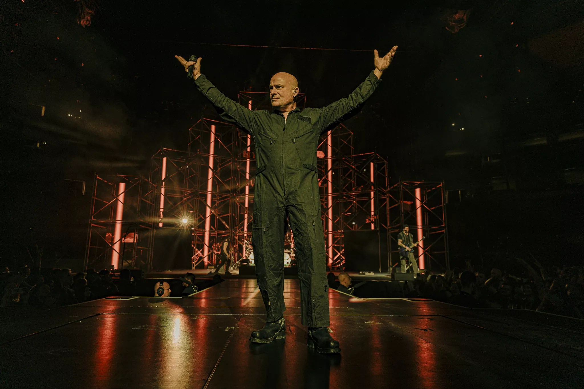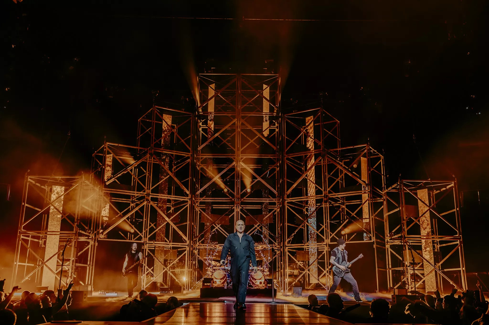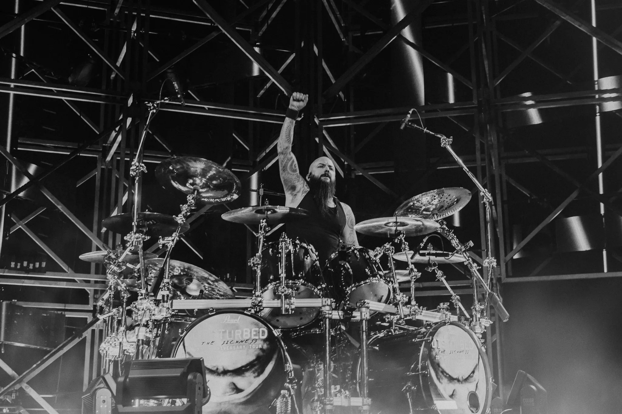 Mike Wengren, Disturbed’s drummer, embracing the crowd at Ball Arena.