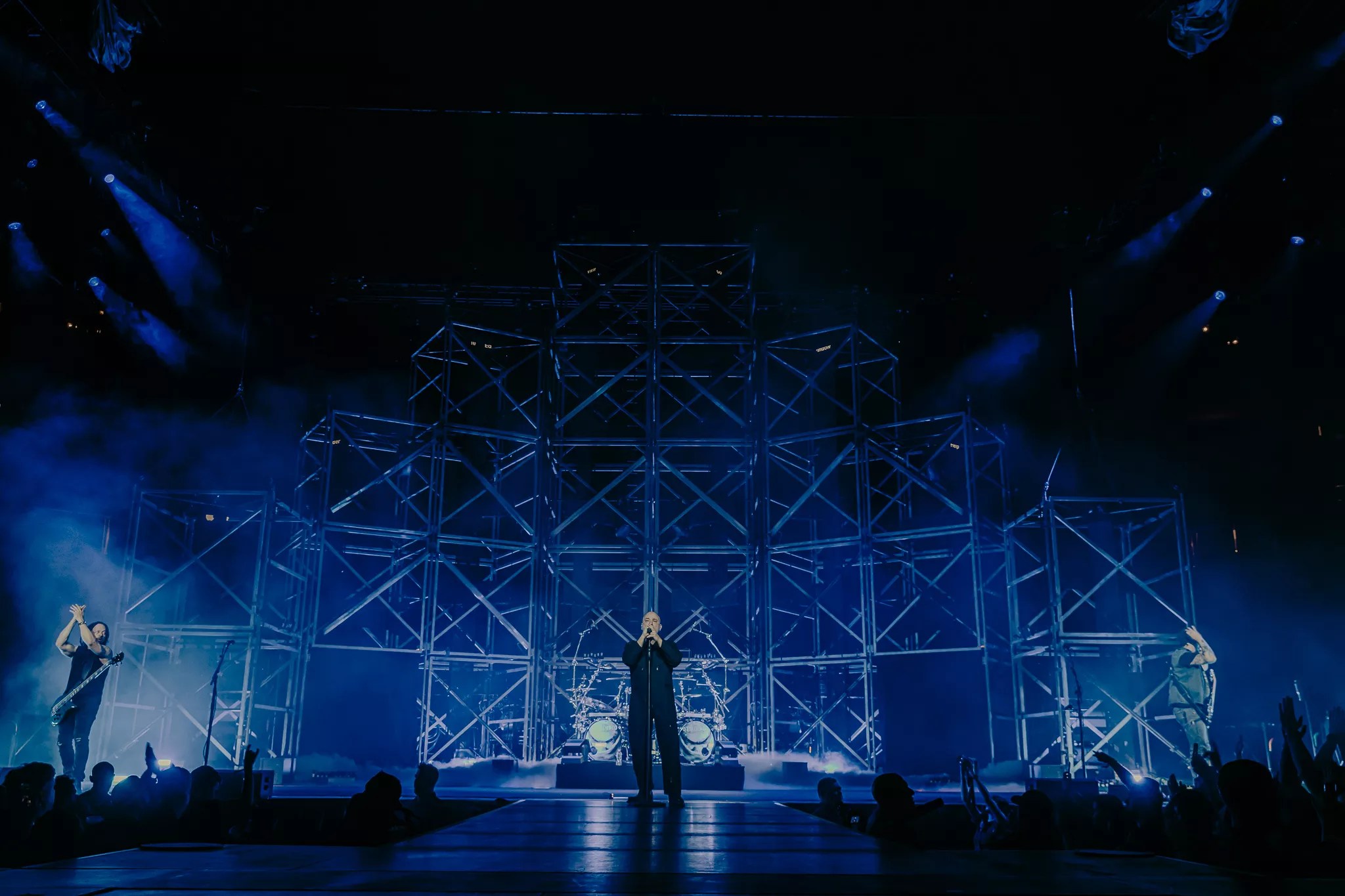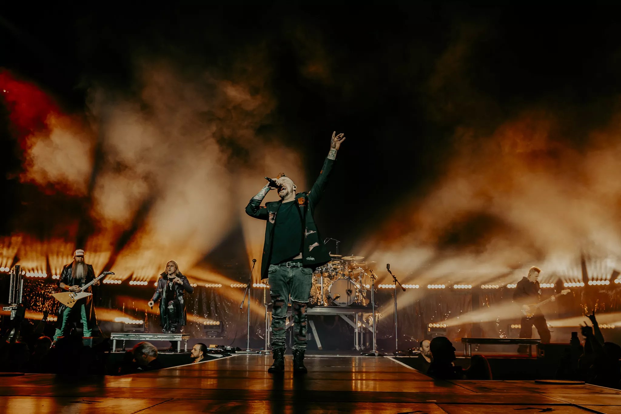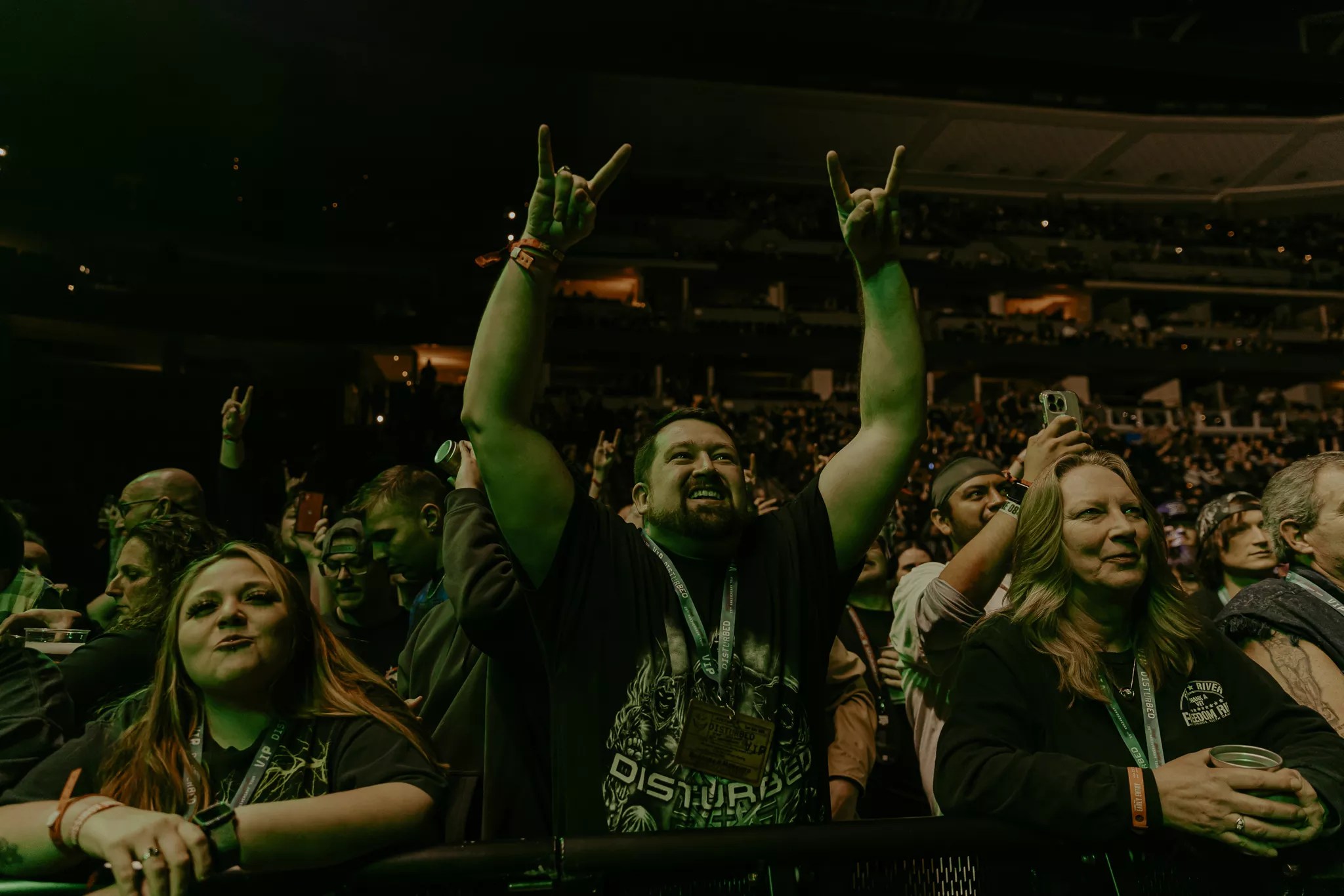 Mike Wengren, Disturbed’s drummer, embracing the crowd at Ball Arena.
