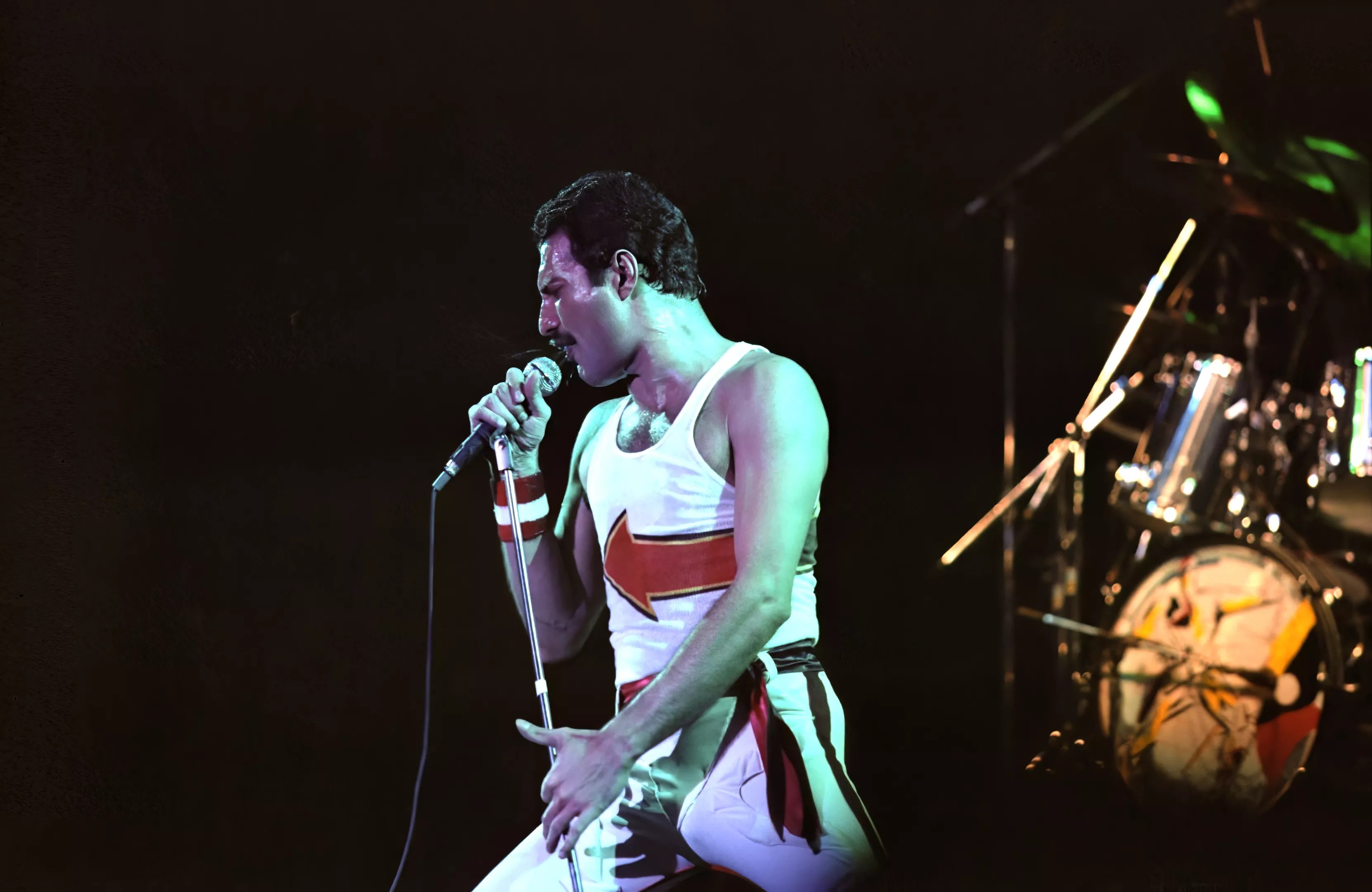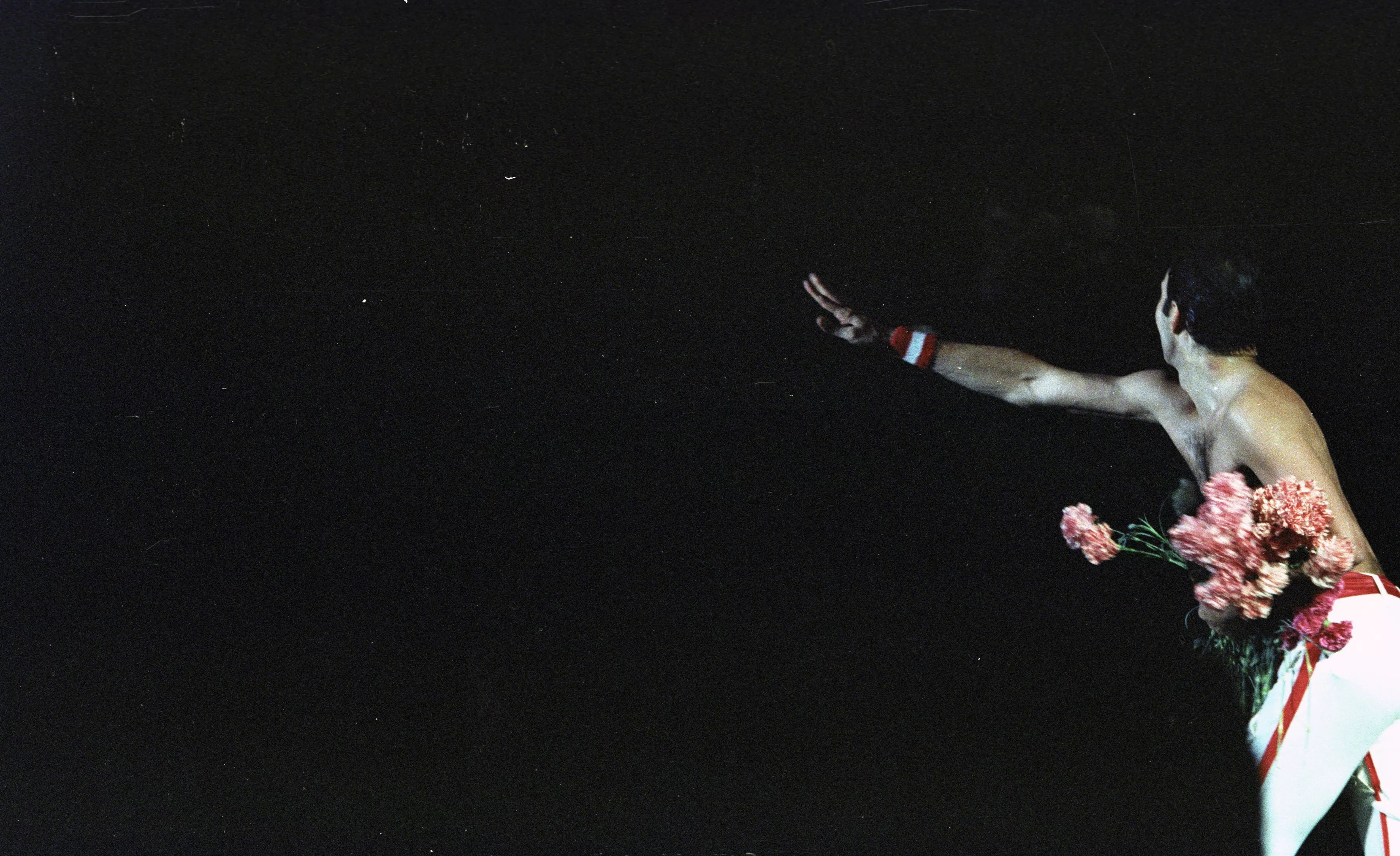 Freddie Mercury throws a bouquet of flowers to his fans.