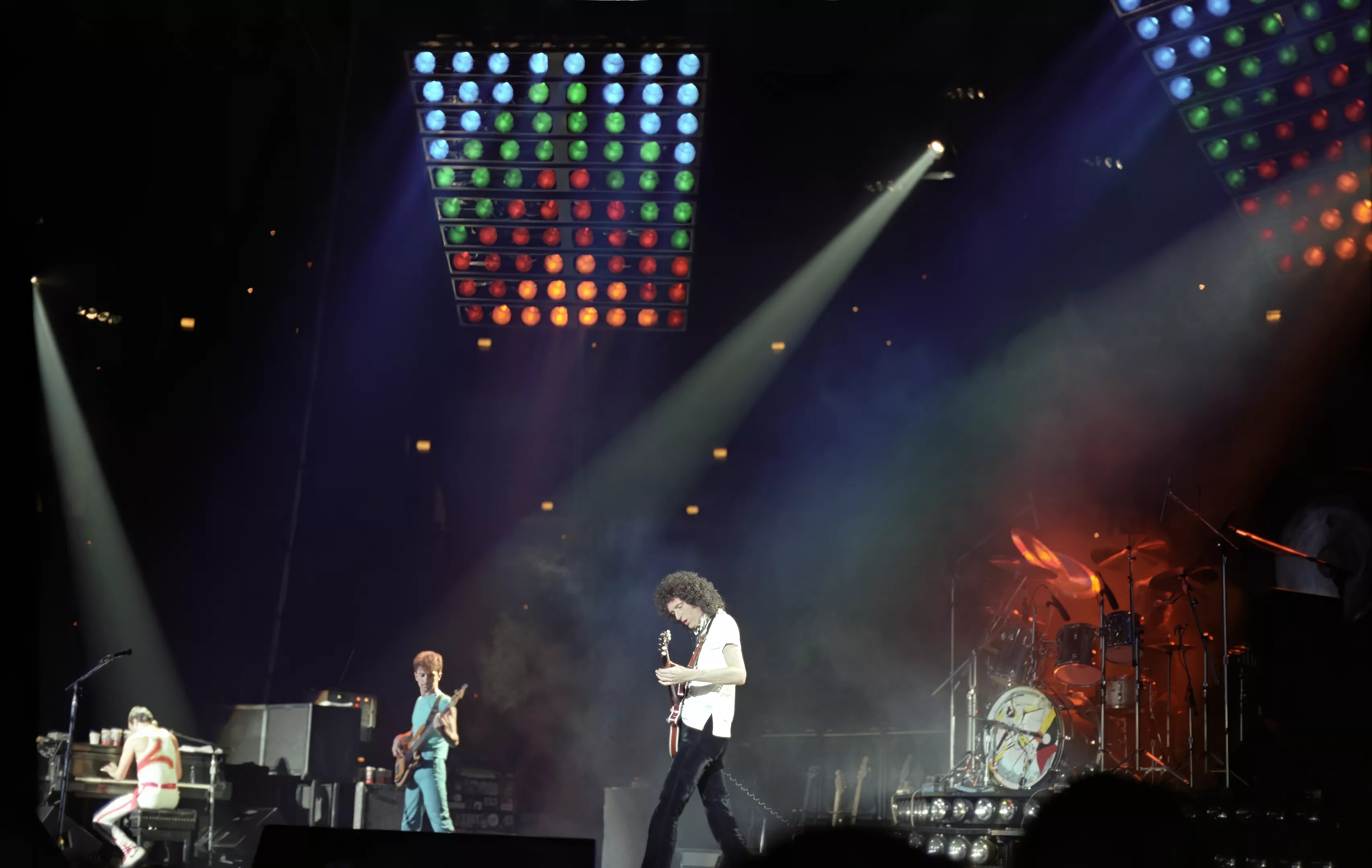 All of them surge with the force of the performers, whether it’s Mercury stripping off a flashy rainbow jacket, which hangs from one arm while he sings, or bowing his head back as May clearly shreds on guitar. It almost makes viewers wonder just what notes he was playing, and it’s impossible not to absorb the passionate response to music that emanates from Mercury’s posture.