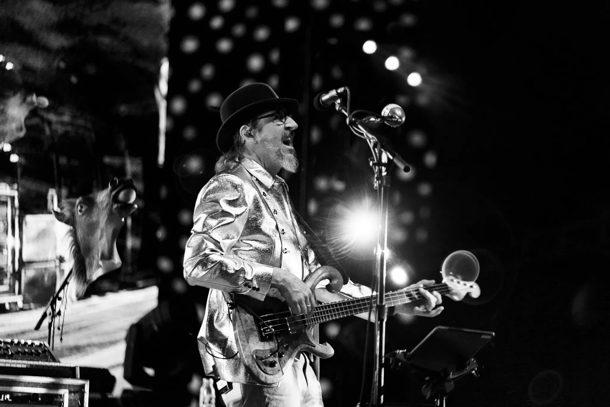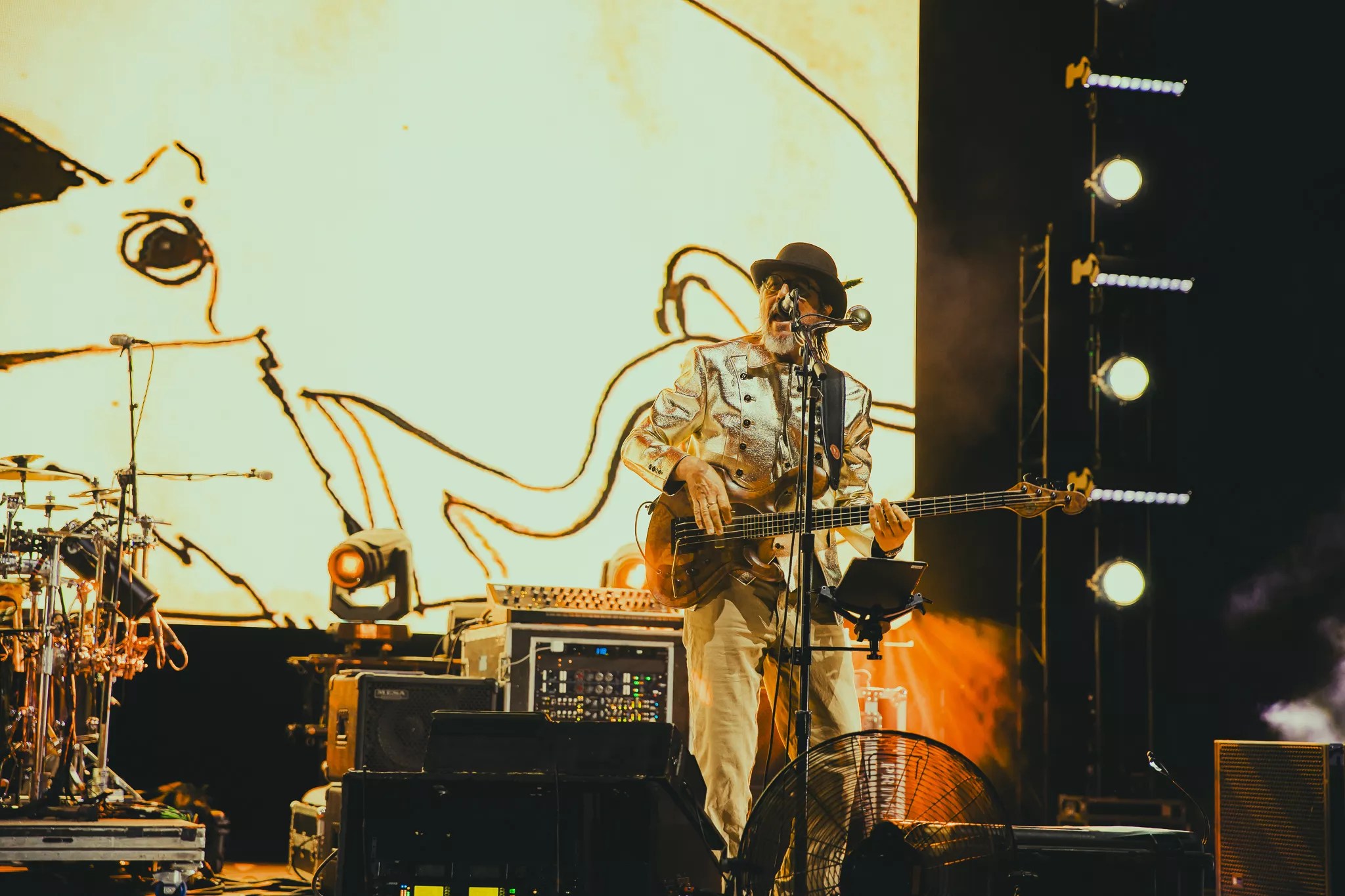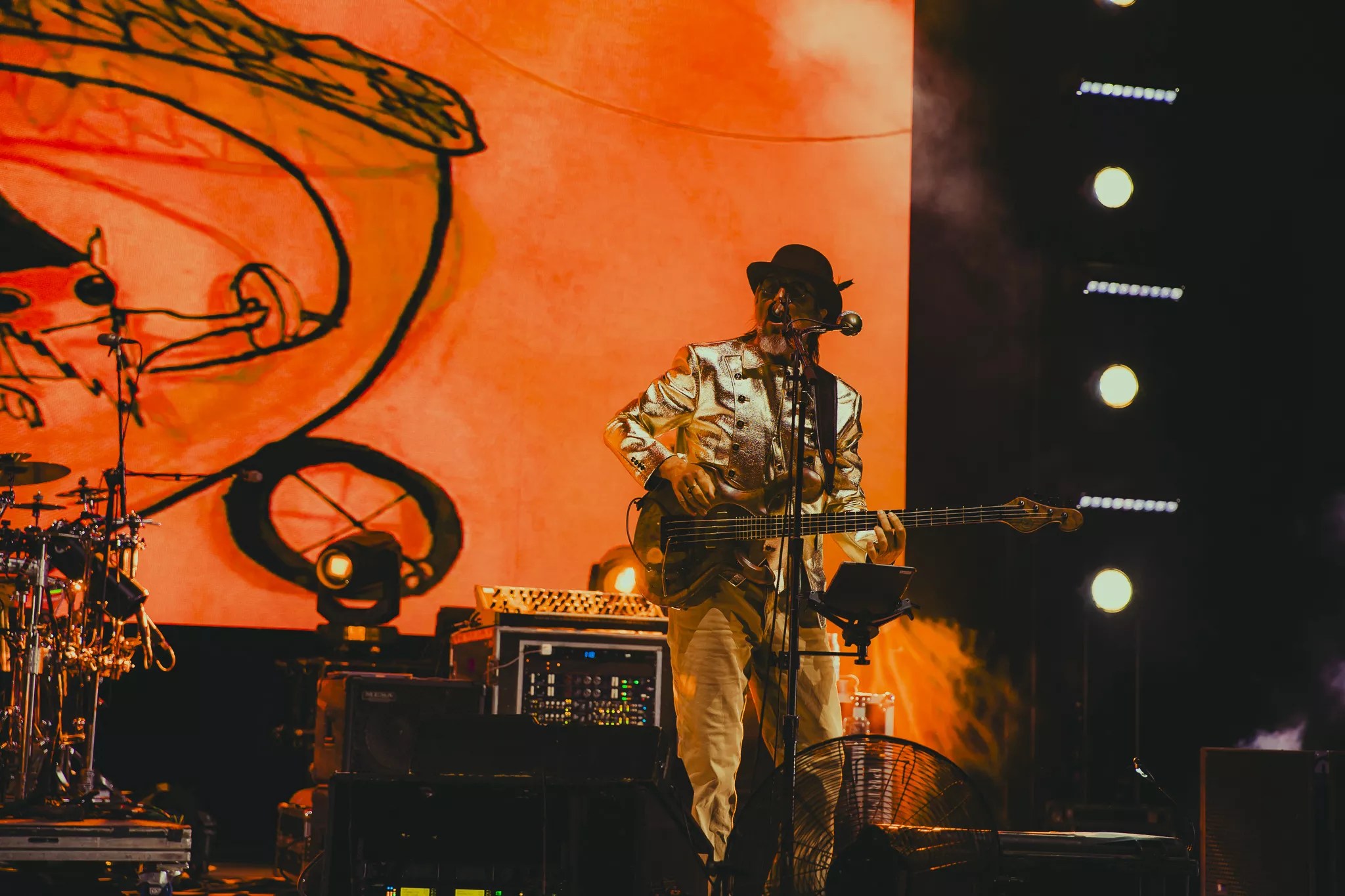 “So much shit has happened since the last time we met,” he said. Clad in a shining gold suit and a porkpie hat with a jaunty feather, he had one leg propped up on an amp, leaning over his bass as he surveyed the audience alongside his bandmates, guitarist Larry LaLonde and new drummer John Hoffman.