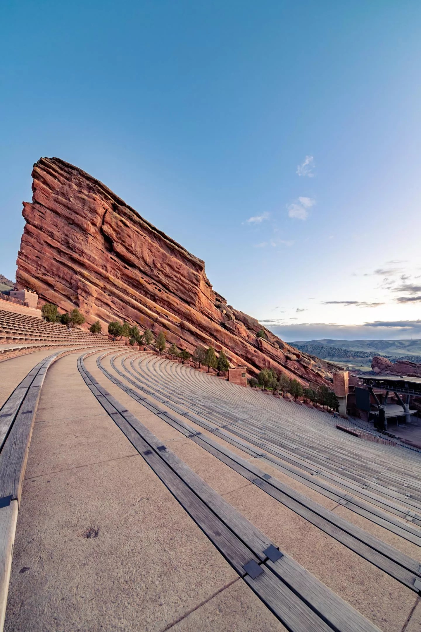 A sunrise in the Rocky Mountains is always profound, but especially from this perch at the edge of the Front Range. As the sun begins its ascent over the Eastern Plains, rays crawl across the silhouette of downtown Denver before slipping over the crest of Morrison’s Dakota Hogback, the cascading ridge that emerged from a shallow sea 50 million years ago, marked by dinosaur footprints from 100 million years before that. And then, a color bomb: The famous sandstone rocks just to the west are aglow, illuminating the majestic umber color and noble stature of the unmistakable natural wonder that became Red Rocks Amphitheatre.