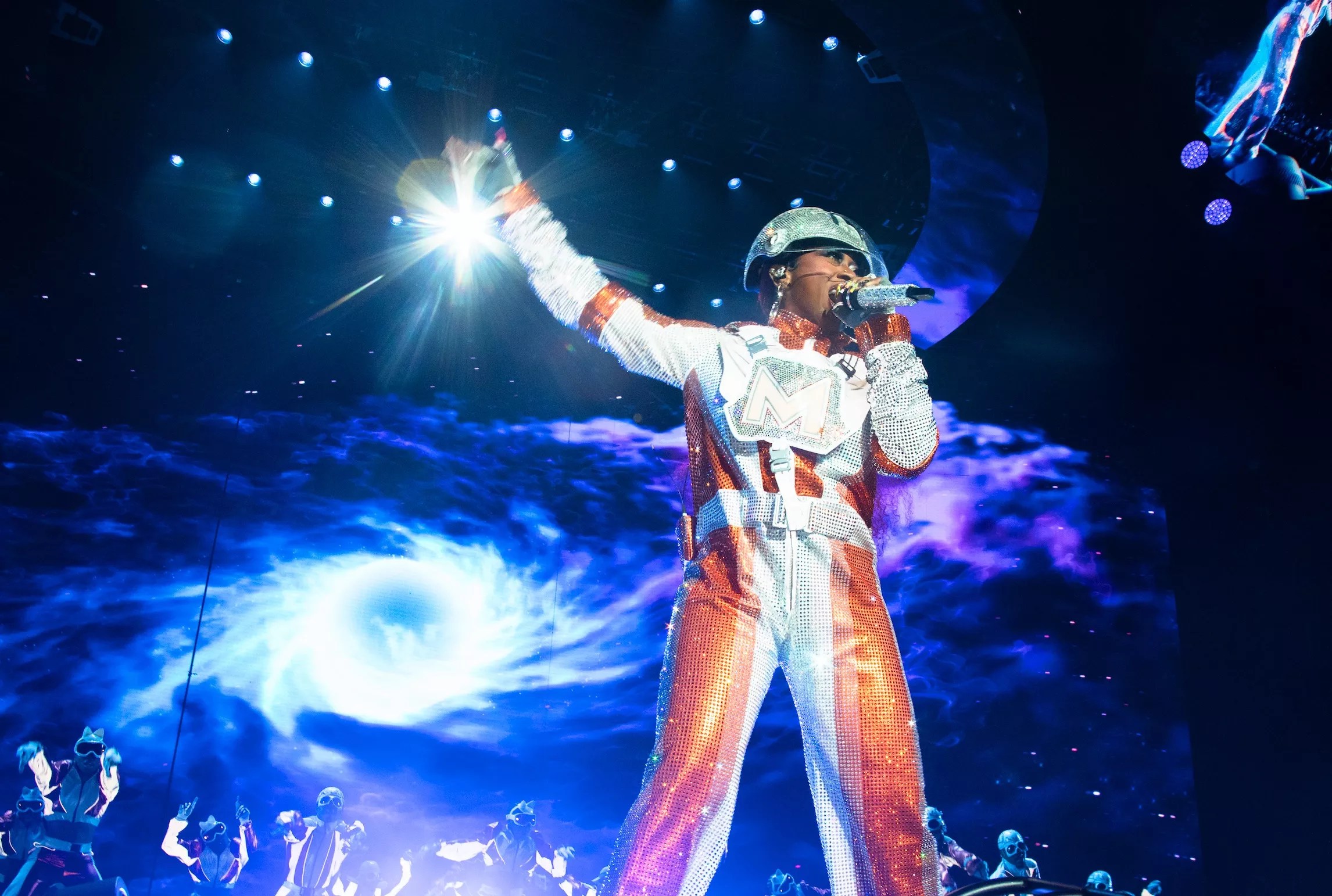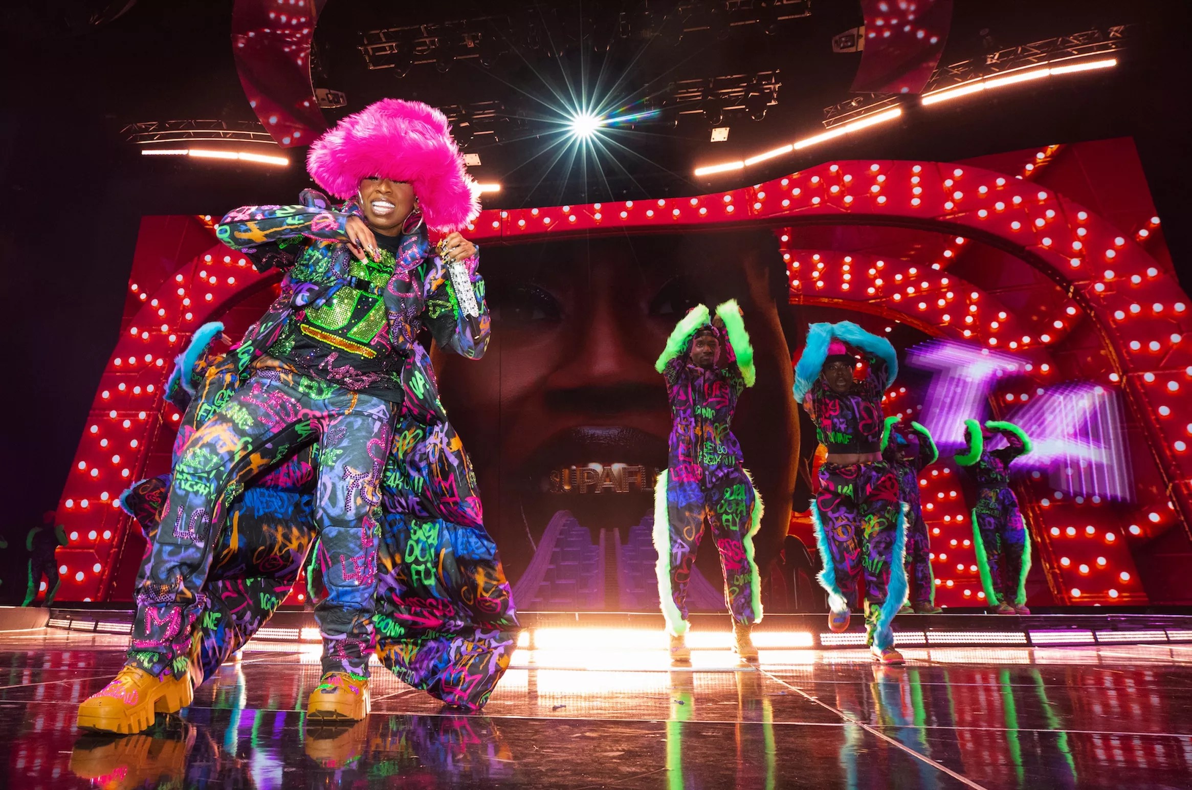 Screens surrounding the stage revealed 3-D effects of a Millennium Falcon-esque spaceship landing, from which Elliott ostensibly emerged in a sparkling orange and white tracksuit and helmet while dancing around the stage. As the arena went dark for a moment, bobbleheads of Elliott in space helmets appeared on the screen as an alien-like voice addressed the crowd over the speakers: “As we get ready for take-off, please make sure your lace-fronts are fastened tight. We are expecting some turbulence as we pass Planet Sock It to Me and Planet Lose Control.”
