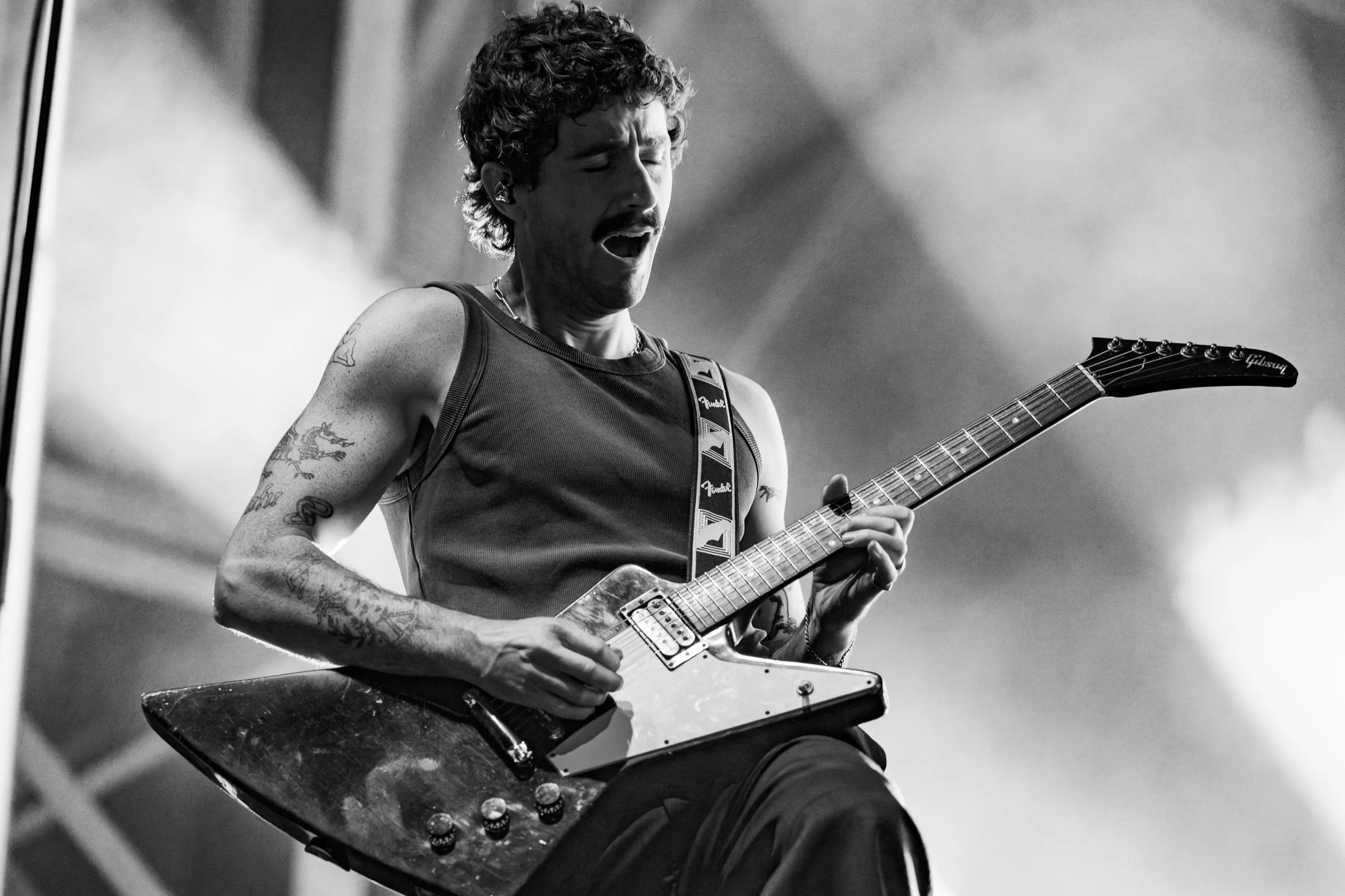 shows. It’s been so long, Mackenzie debuted a new twist on the 2014 track when he sprinkled in flute. Shortly after, he spotted a sign held by a fourteen-year-old fan named Callum and pulled him on stage, then handed him his signature Gibson Flying V guitar so the young axeman could fulfill his dream of playing “Superbug” with King Gizz. Stu Mackenzie playing the flute during the “Nathan” portion of the set. Ross Jones