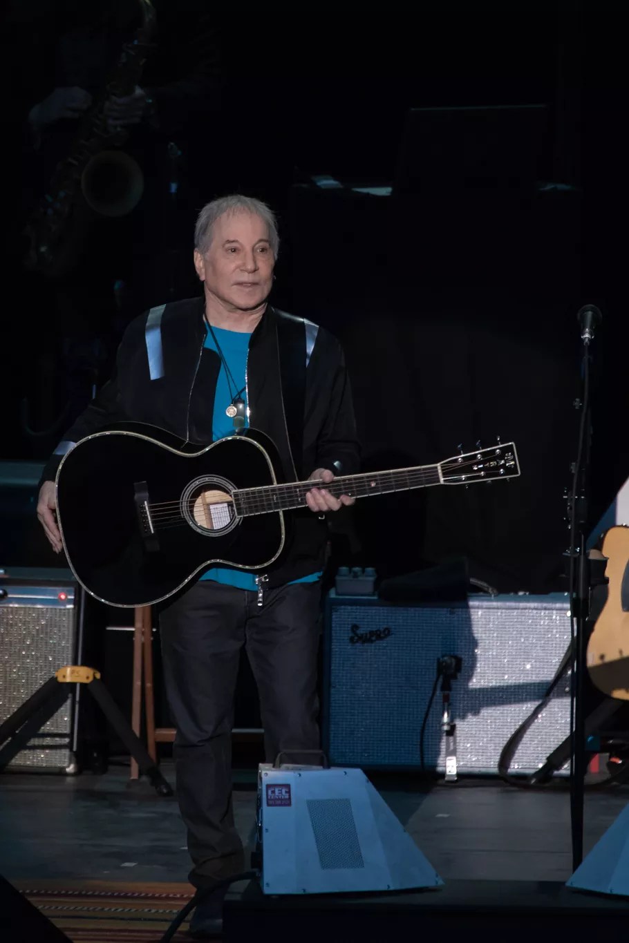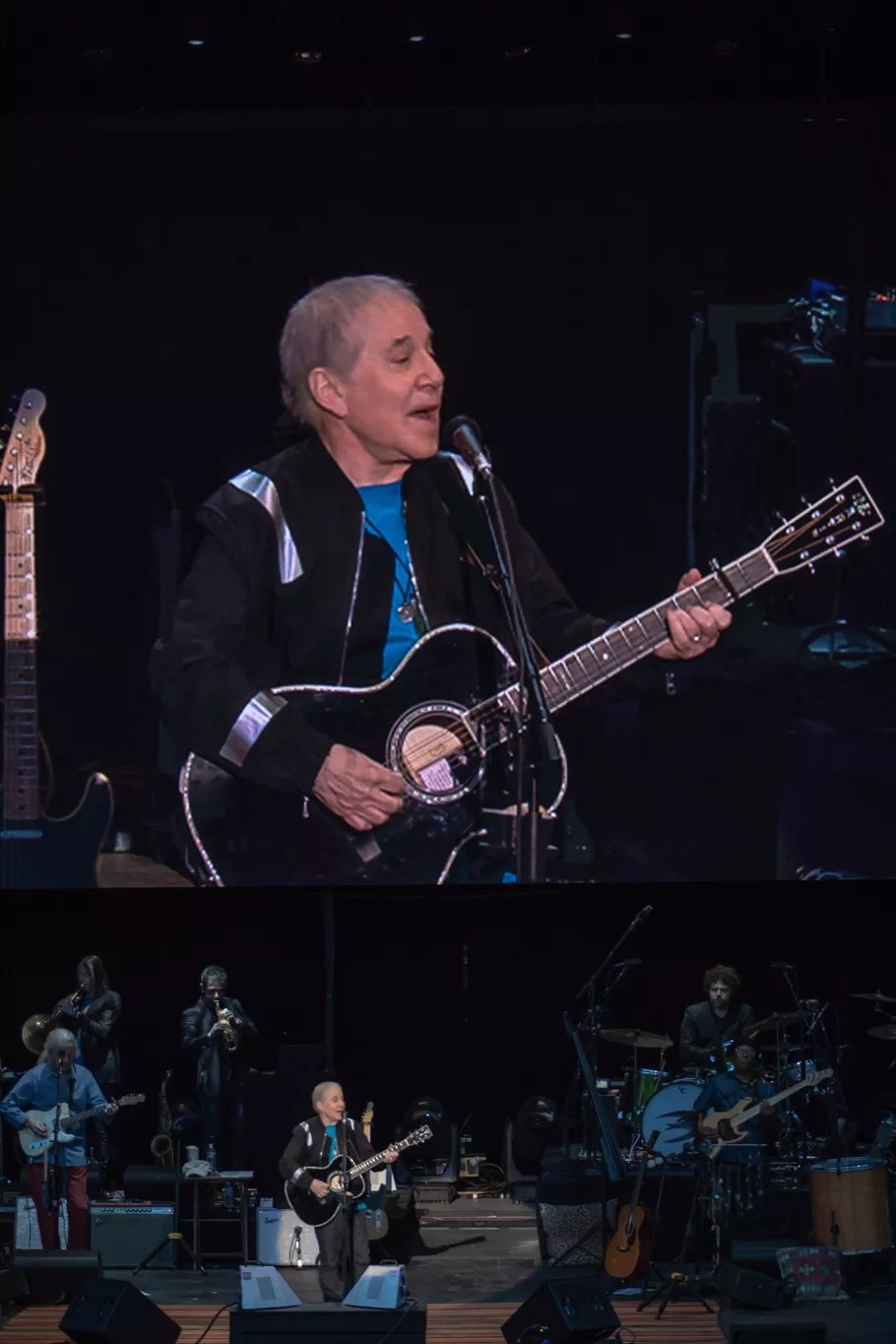 “He looks a lot older than when we saw him last year,” a woman from Brooklyn sitting to my left said. Within moments she was marveling that Simon was also having a lot more fun than the last few times she’d seen him on stage, “talking a lot more between songs” and dancing around in his sleek black jacket with silver highlights. The jacket matched his black-and-silver acoustic guitar.