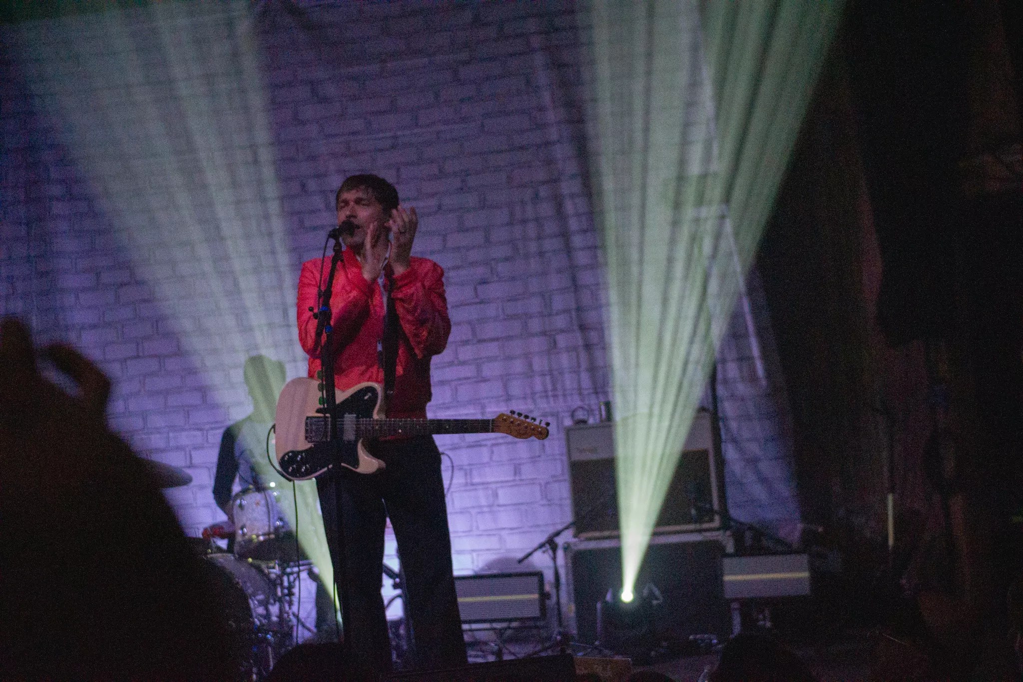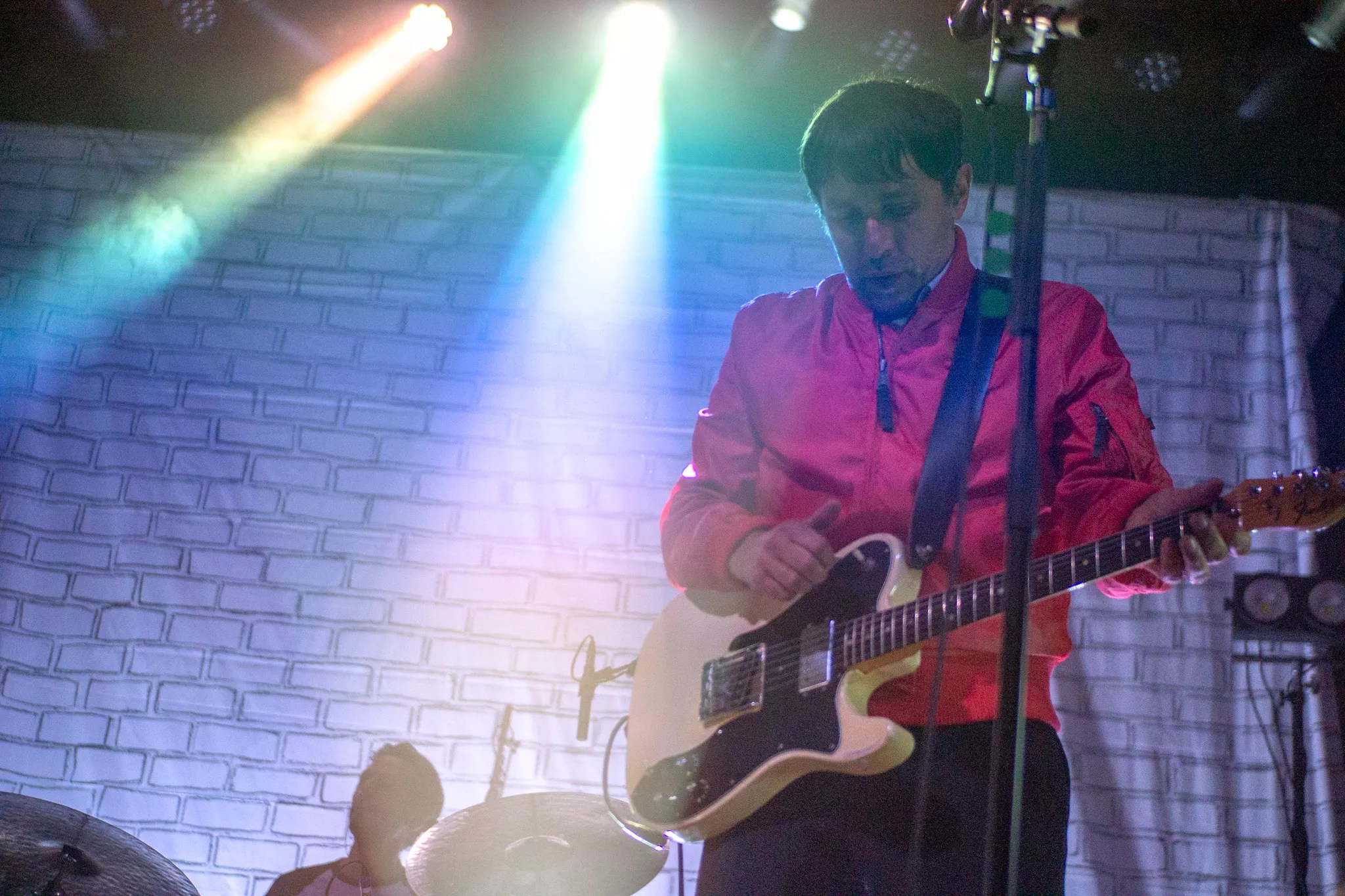 Peter of Peter Bjorn and John plays in one of the band’s merch shirts from the 2025 tour during the encore at Denver’s Bluebird Theater.