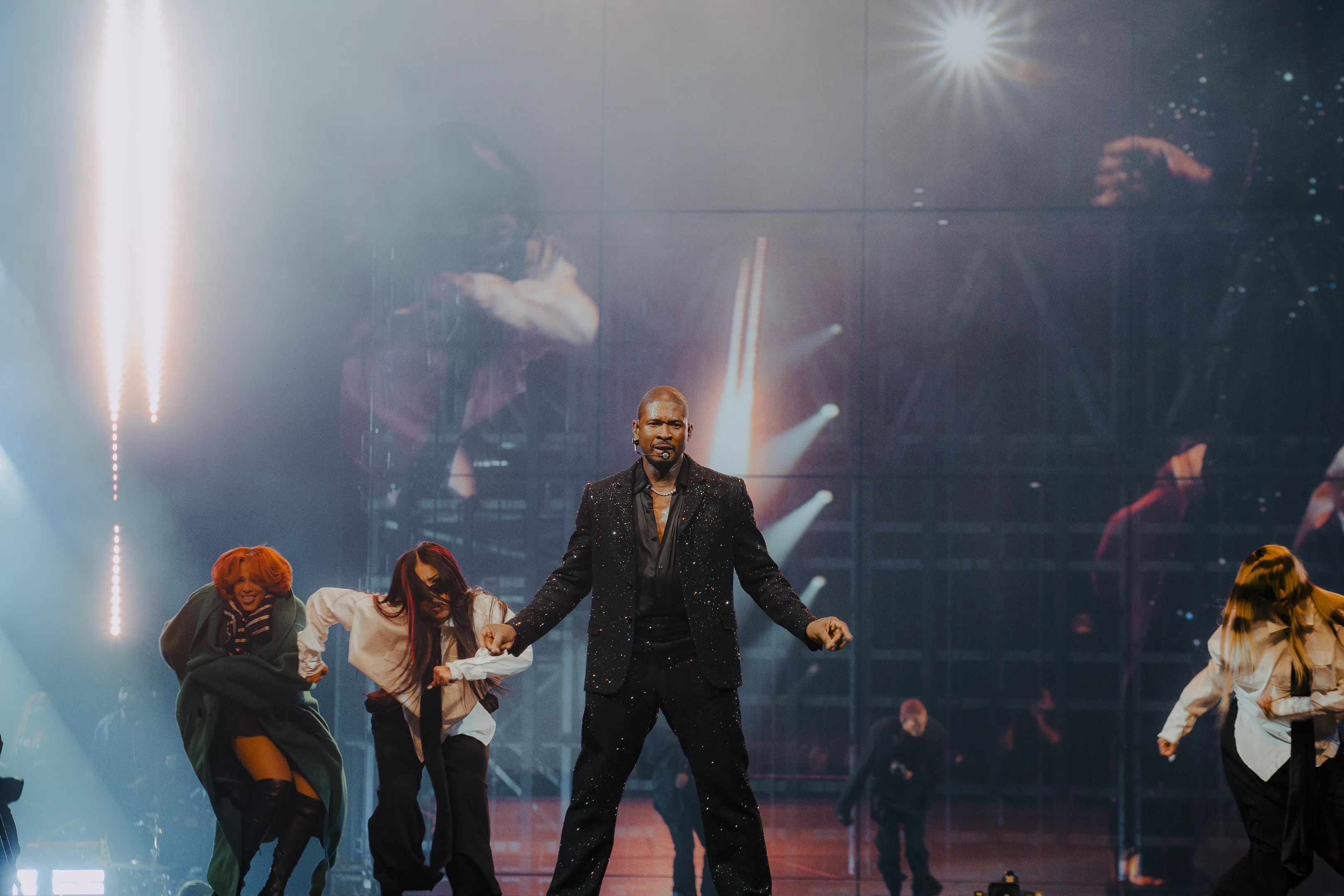 Usher’s performance included multiple stage changes, from skating rinks to dancing poles.