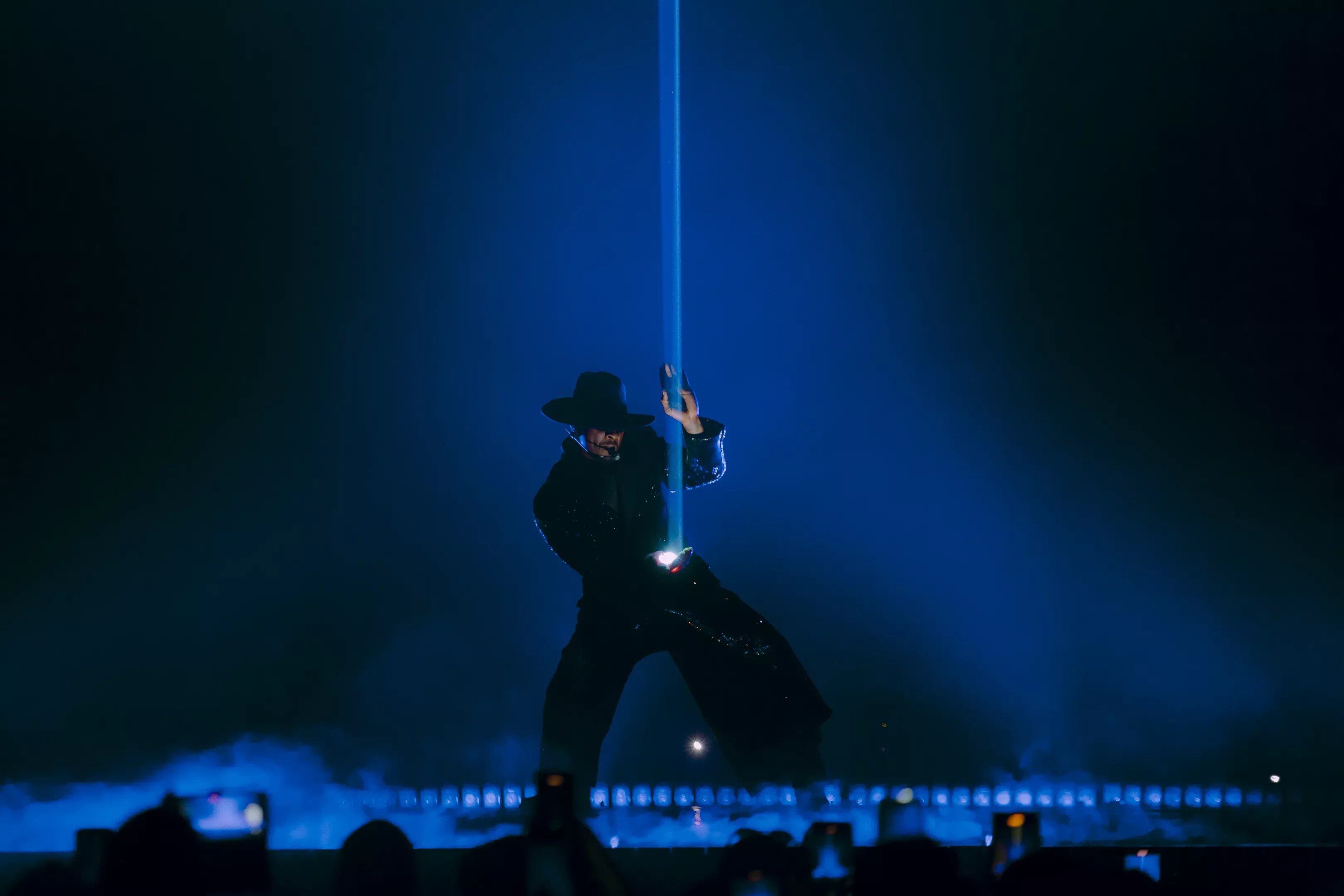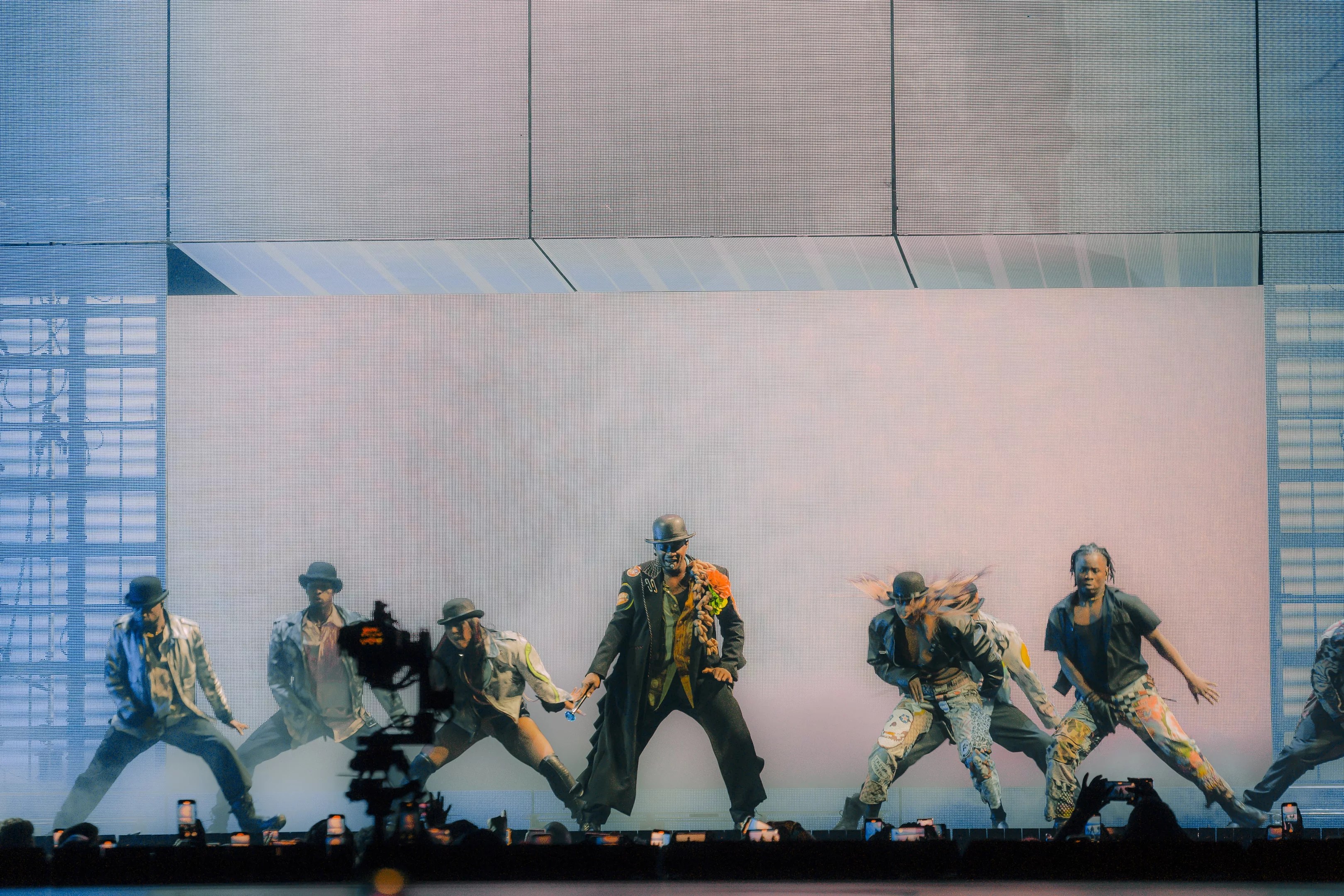 Usher danced with the spotlight, pushing beams of light away or appearing to grip onto them as he kicked off the set with “Hey Daddy (Daddy’s Home),” soon joined by a squad of background dancers, before performing “BIG.”