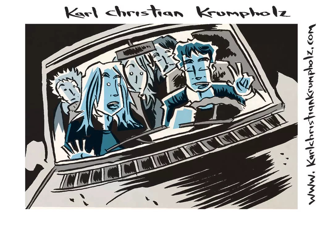 Joey Shapiro: “The last show of our tour was in Salt Lake City before we were to head back home to Denver. Late at night, while driving on a scary stretch of highway in Wyoming where the road twisted and semi-trucks whizzed past us at ninety miles an hour, our tour bus’s steering and brakes suddenly blew out. Our guitarist, Eric, somehow managed to keep the bus straight on the road until we stopped. One wrong curve, and it would have been game over. It was 2 a.m. We were able to find a cell phone signal and posted on Facebook for help. Karl Christian Krumpholz