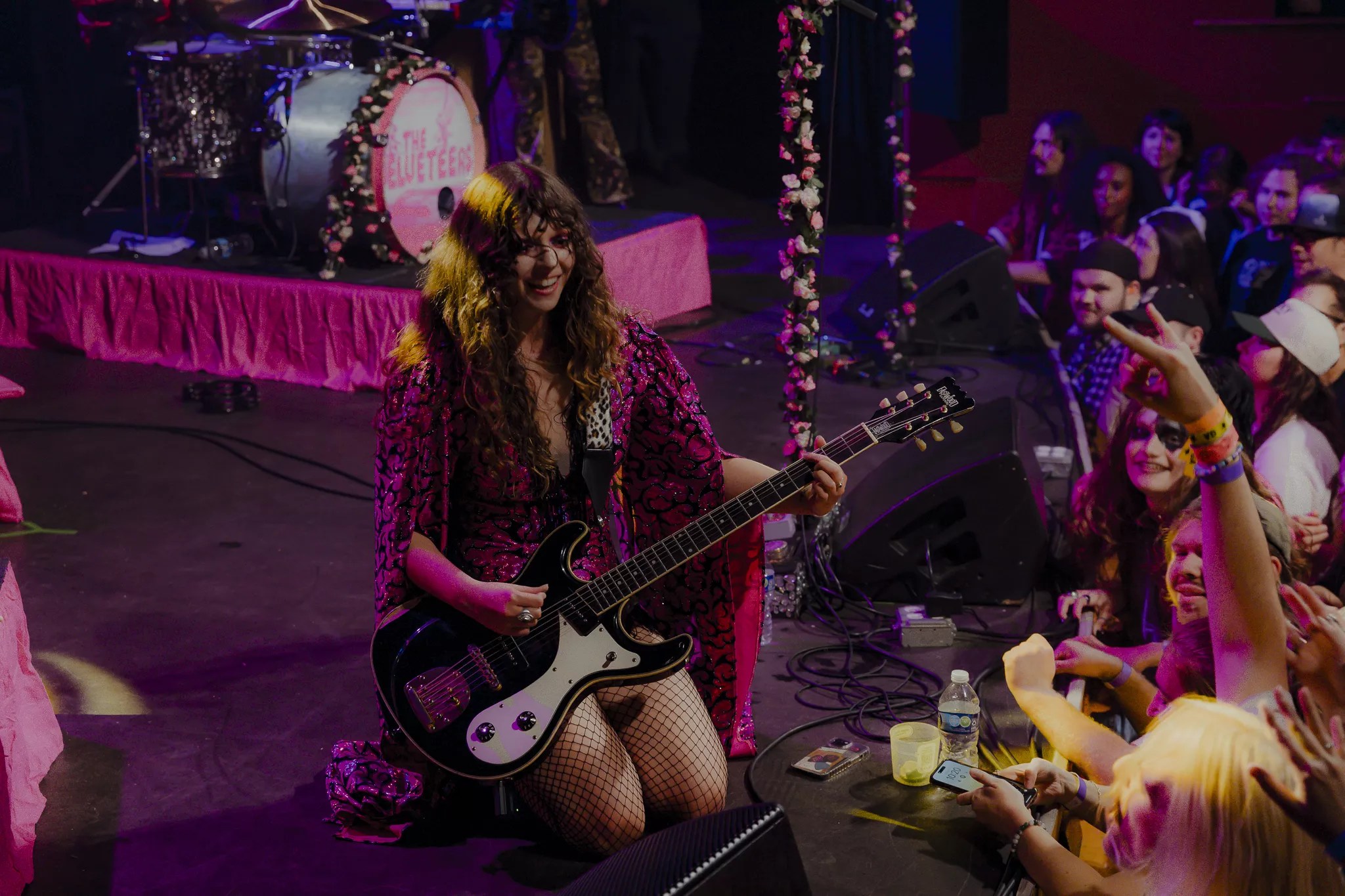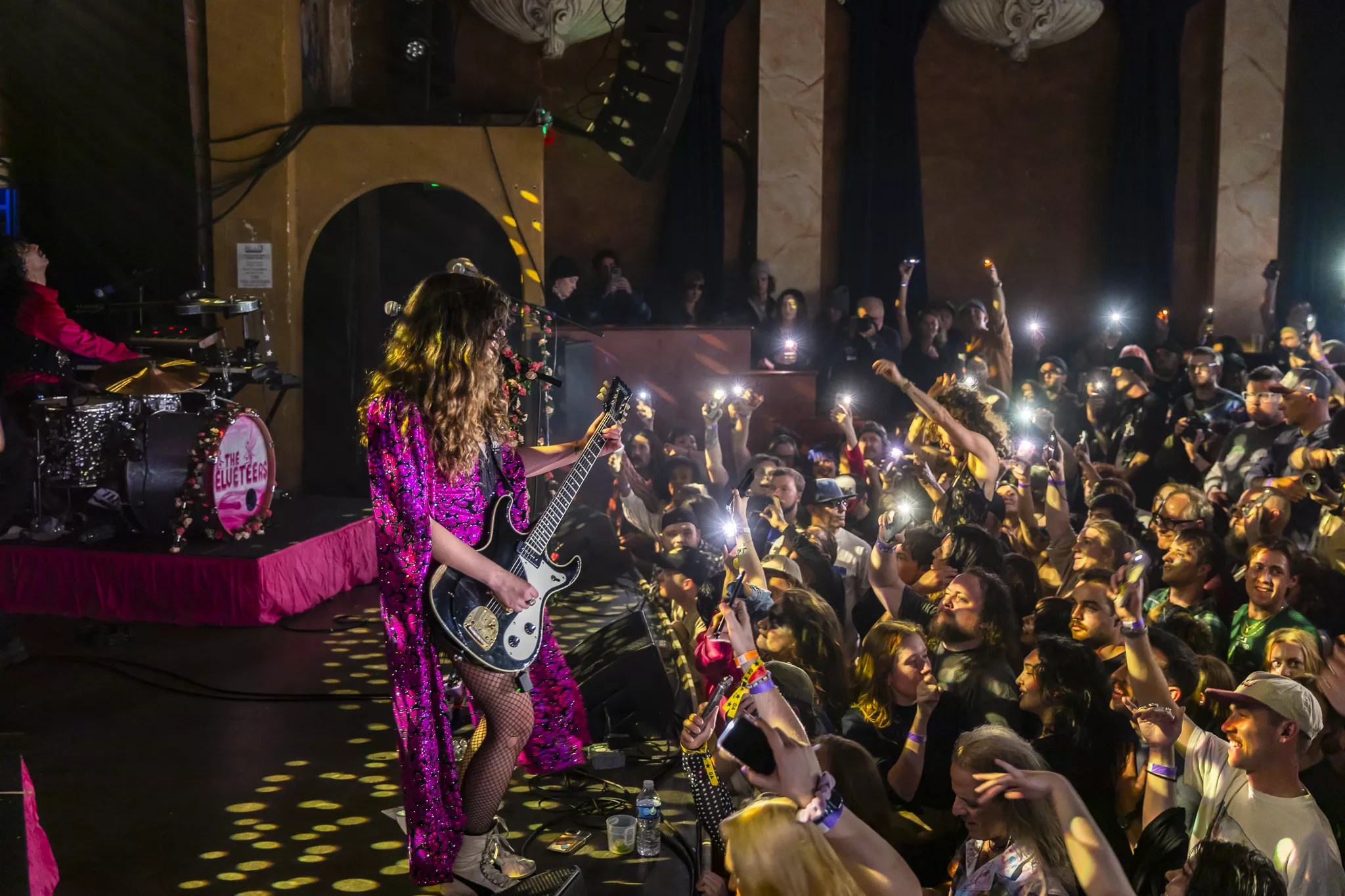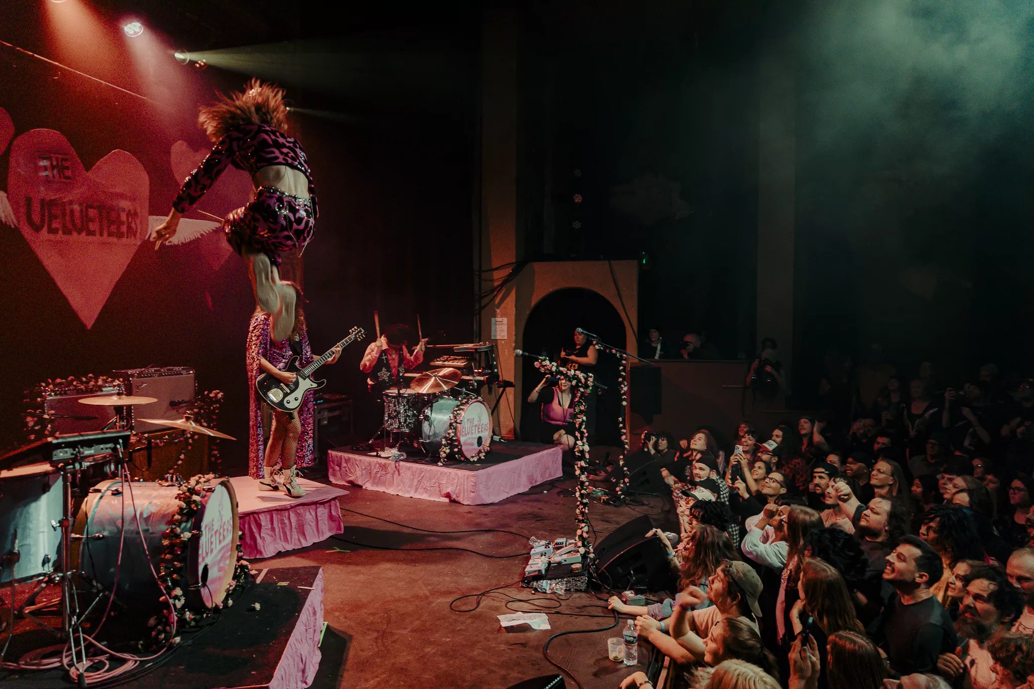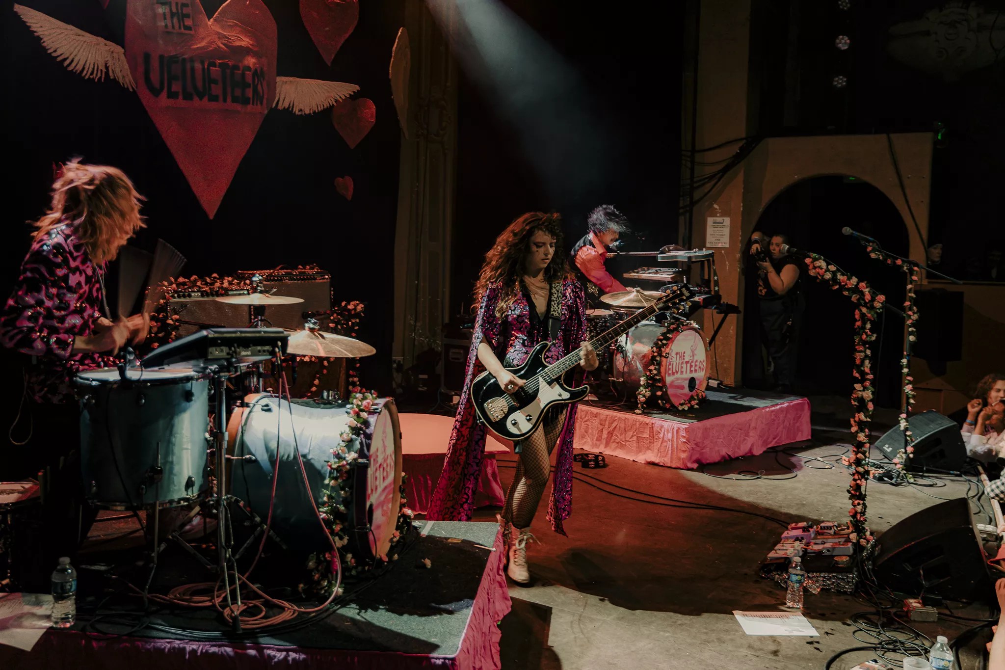 The vibes were high, and the Velveteers were about to make them peak. Two drum kits were rolled onto the stage atop pink platforms, complementing the entire setup: a giant pink heart emblazoned with “the Velveteers” hung in the center behind the band, framed by a large, silver crescent moon and smiling orange sun. It evoked a dreamy, ’80s glam-rock aesthetic that the members themselves lean into – and as they strode onto the stage, the crowd roared. Demi Demitro, decked out in a sparkling hot-pink ensemble, came to her spot at center stage, while Baby Pottersmith, also in pink sequins, and Jonny Fig sat at their kits.