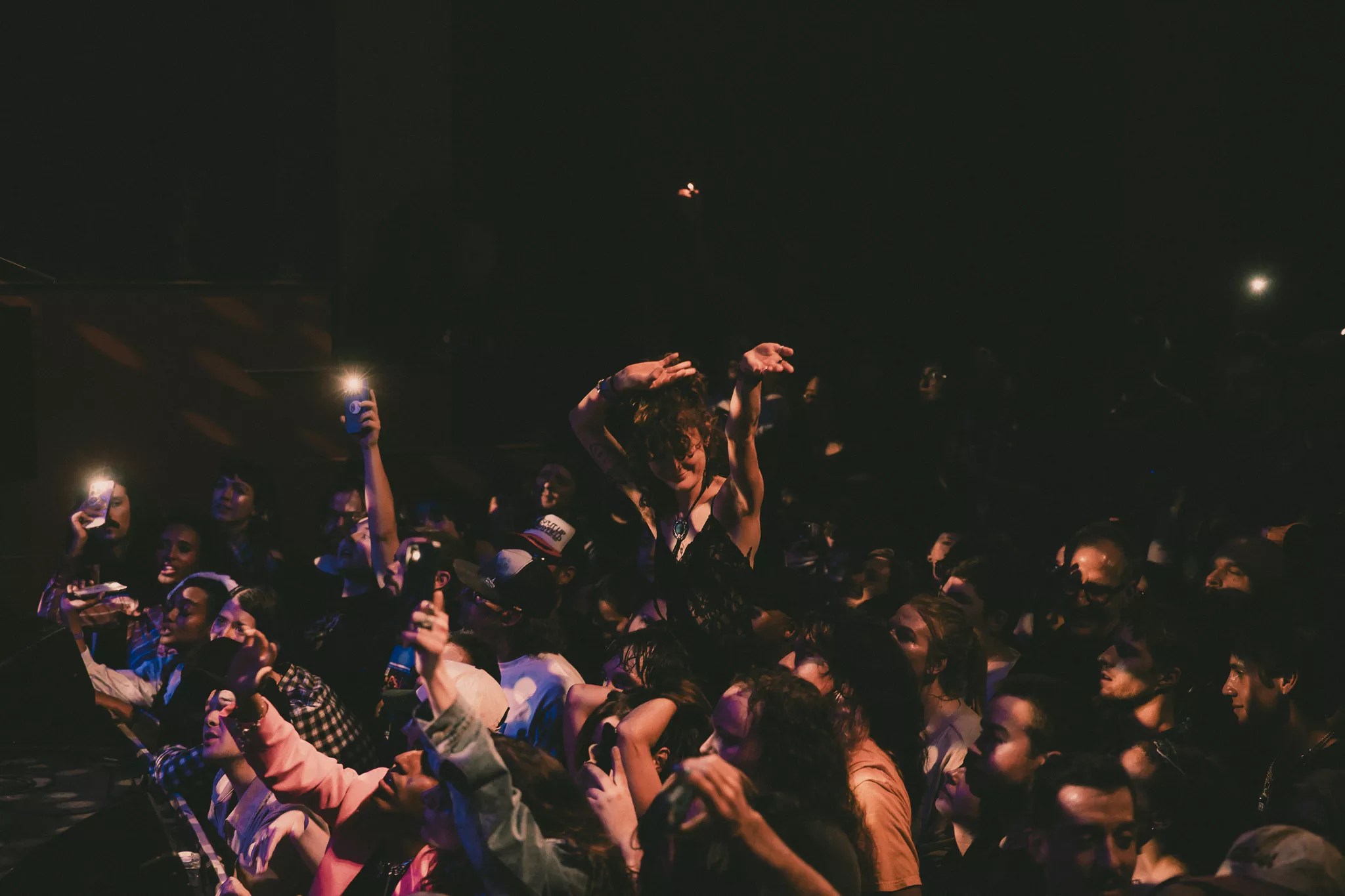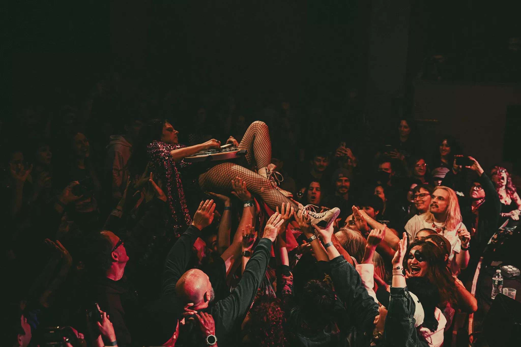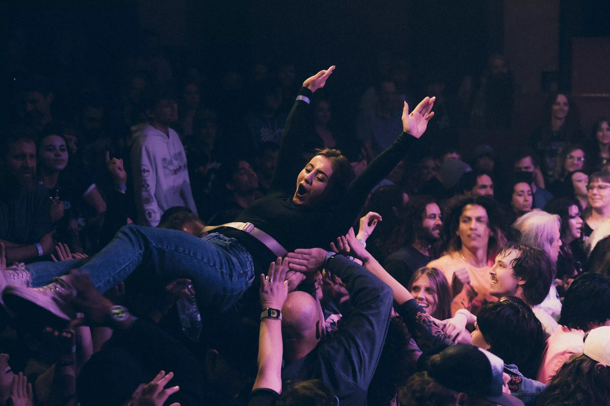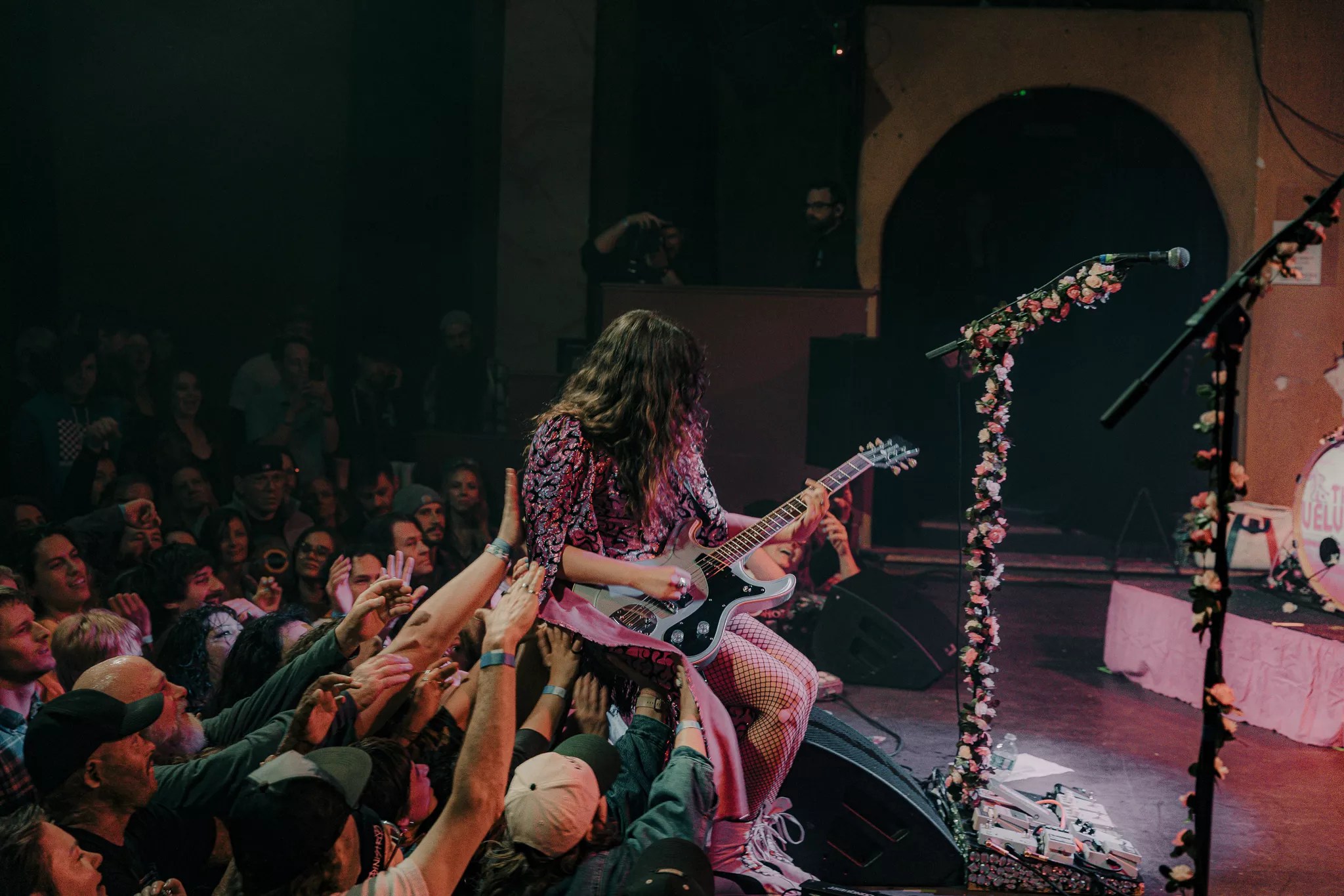 What followed was a pristine demonstration of raw, authentic rock and roll. The band’s new album is an amalgamation of unfettered, youthful creativity navigating the complexities of social strata and adulthood, and Demitro sang new songs such as “On and On” with abandon as Pottersmith and Fig bashed on their drums. The sound was intense and unadulterated, evoking that primal spirit for which rock and roll thrives. Demitro owned the stage like a rock demigod, casting a spell with her guitar that had us headbanging, crowd surfing, moshing and dancing. And she crowd surfed, too, while offering a guitar solo at the same time. Demi Demitro, of The Velveteers, crowd-surfing. Photography by: Brandon Johnson (@bjohnsonxar)