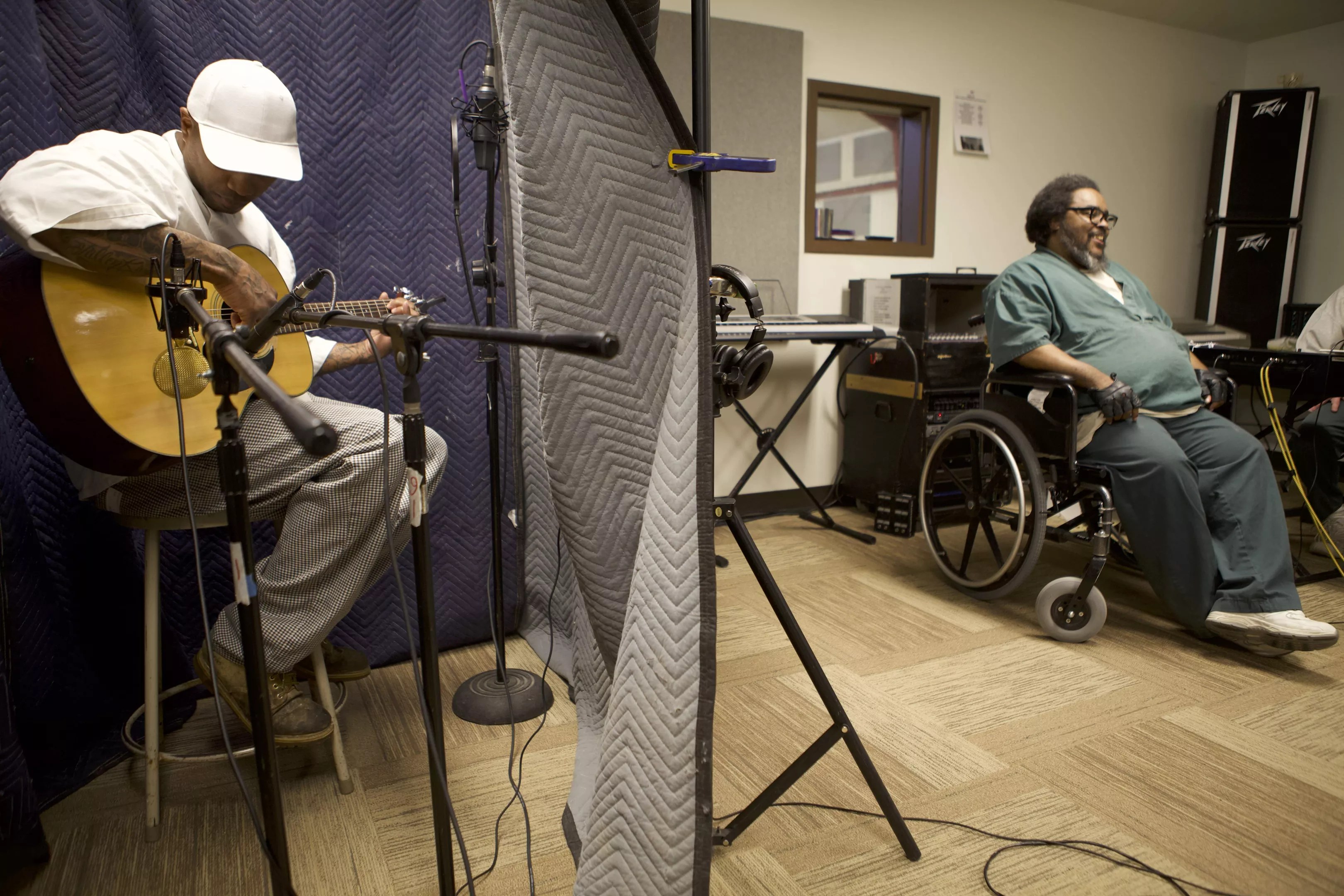 Even though Young was not looking for white musicians, he figured it was worth exploring the connection to see if Whitman’s friend knew any Black musicians inside with him. He received an enthusiastic letter from the friend, a man named Michael Tenneson who was incarcerated at Territorial Correctional Facility in Cañon City, Colorado. Coincidentally, Young also met the director of the Colorado Department of Corrections, Rick Raemisch, around the same time. Raemisch granted Young four days to record at the prison in April 2018, and with the help of Tenneson, he recruited six other musicians.