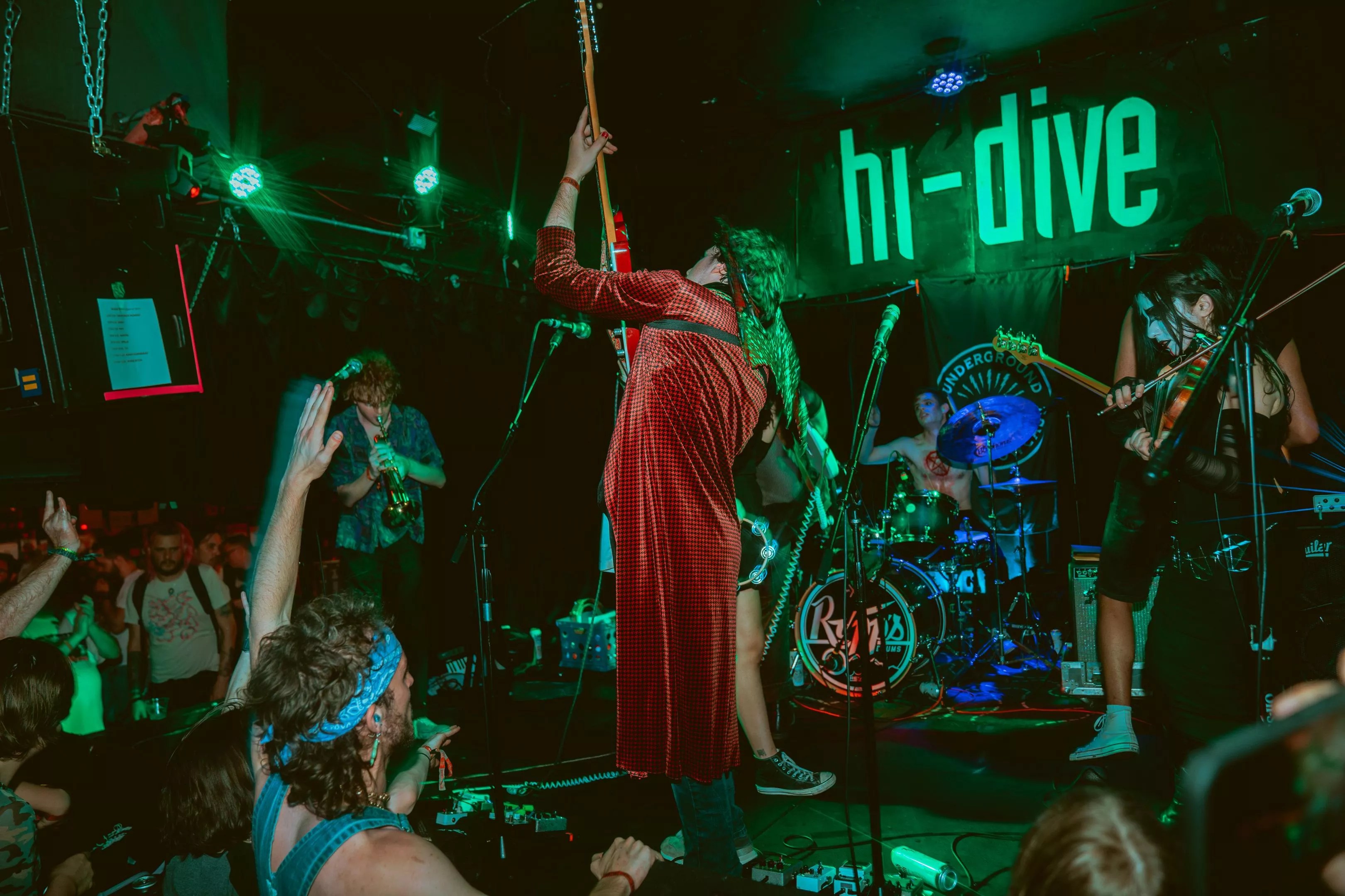 Our highlight on Saturday came with Mr. Knobs, an indefinable four-piece that had the hi-dive crowd mesmerized and moving. Fronted by vocalist “Mister Knobs,” the band includes fiddle, bass, guitar and drums, and alternates between ethereal and heavy, with mind-bending exchanges between the fiddle and vocals. After leaving our brains on the floor, we were then carried away by the rugged blues rock of Shady Oaks, which took over the stage for a raucous set that included frontman Ty Gallaway storming the crowd while shredding the guitar. And the crazy didn’t stop there: Rootbeer Richie was on next for the secret set, with a line around the venue of fans eager to get in.