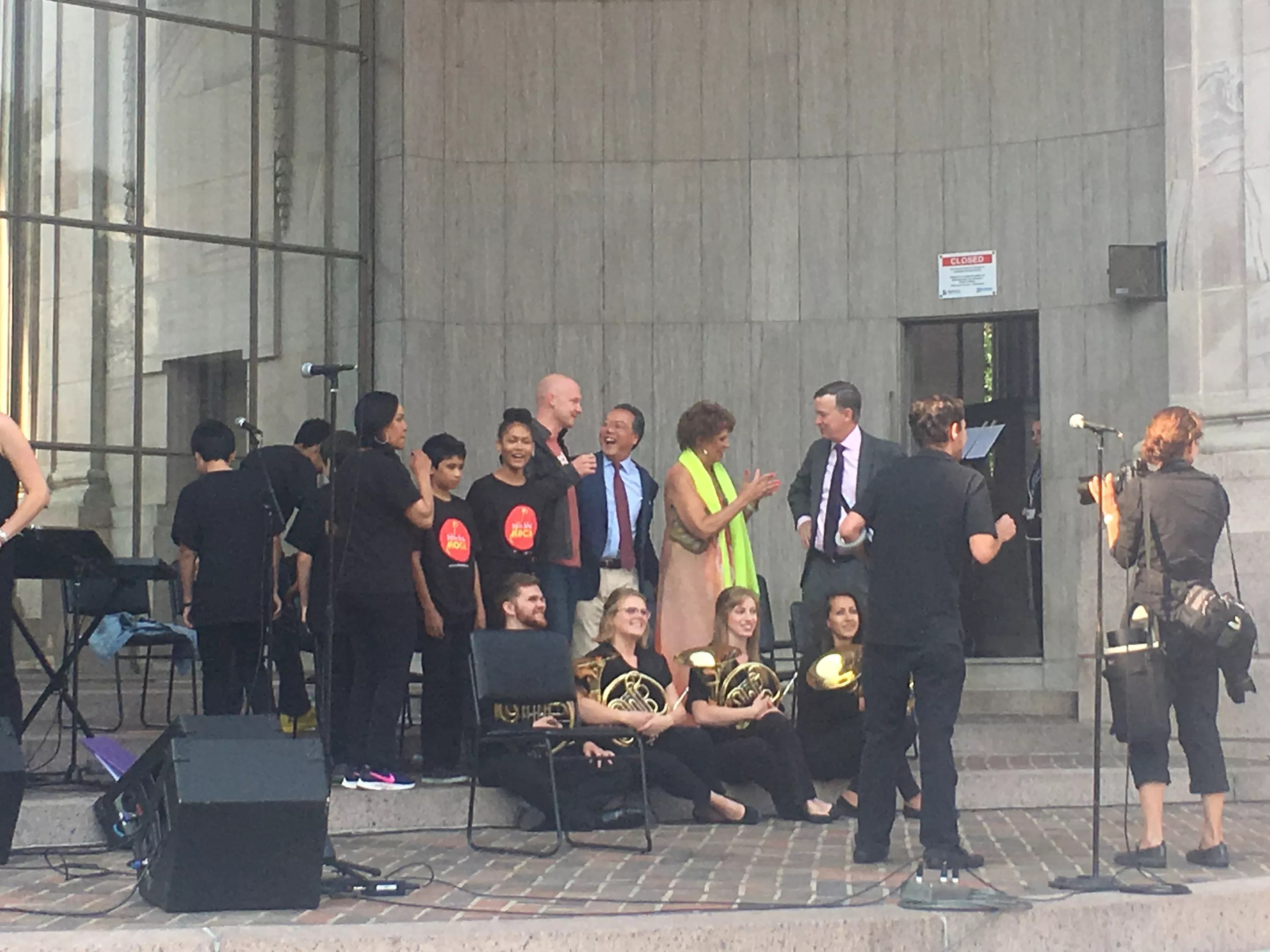 Isaac Slade (center), Yo-Yo Ma, Cleo Parker Robinson, Governor John Hickenlooper and music students at Civic Center Park.