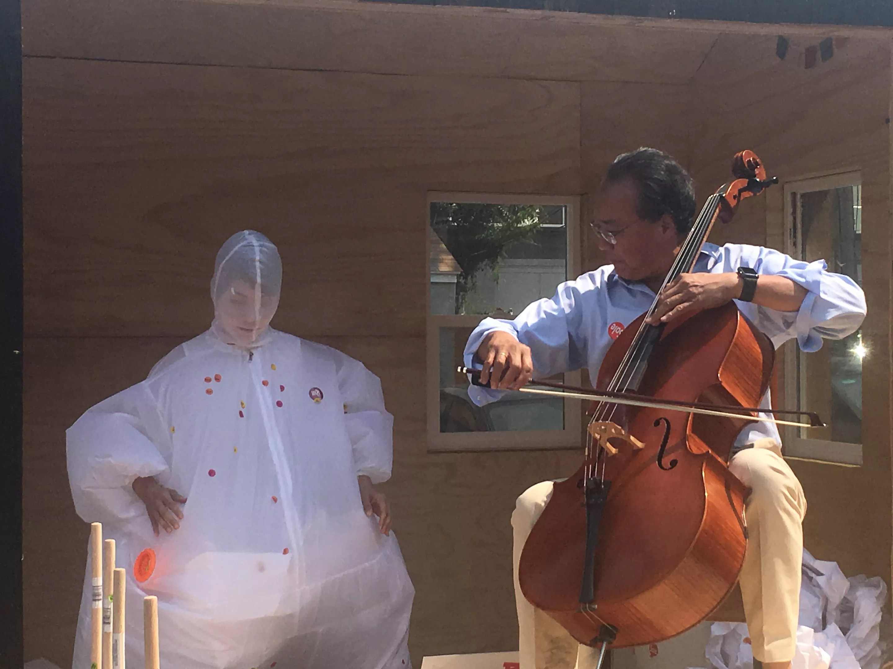 As Ma played, resident artists at Redline performed in sumo suits littered with price tags, critiquing consumer culture; Ma joined in on the fun by making silly faces and even hitting a beach ball with his cello bow.