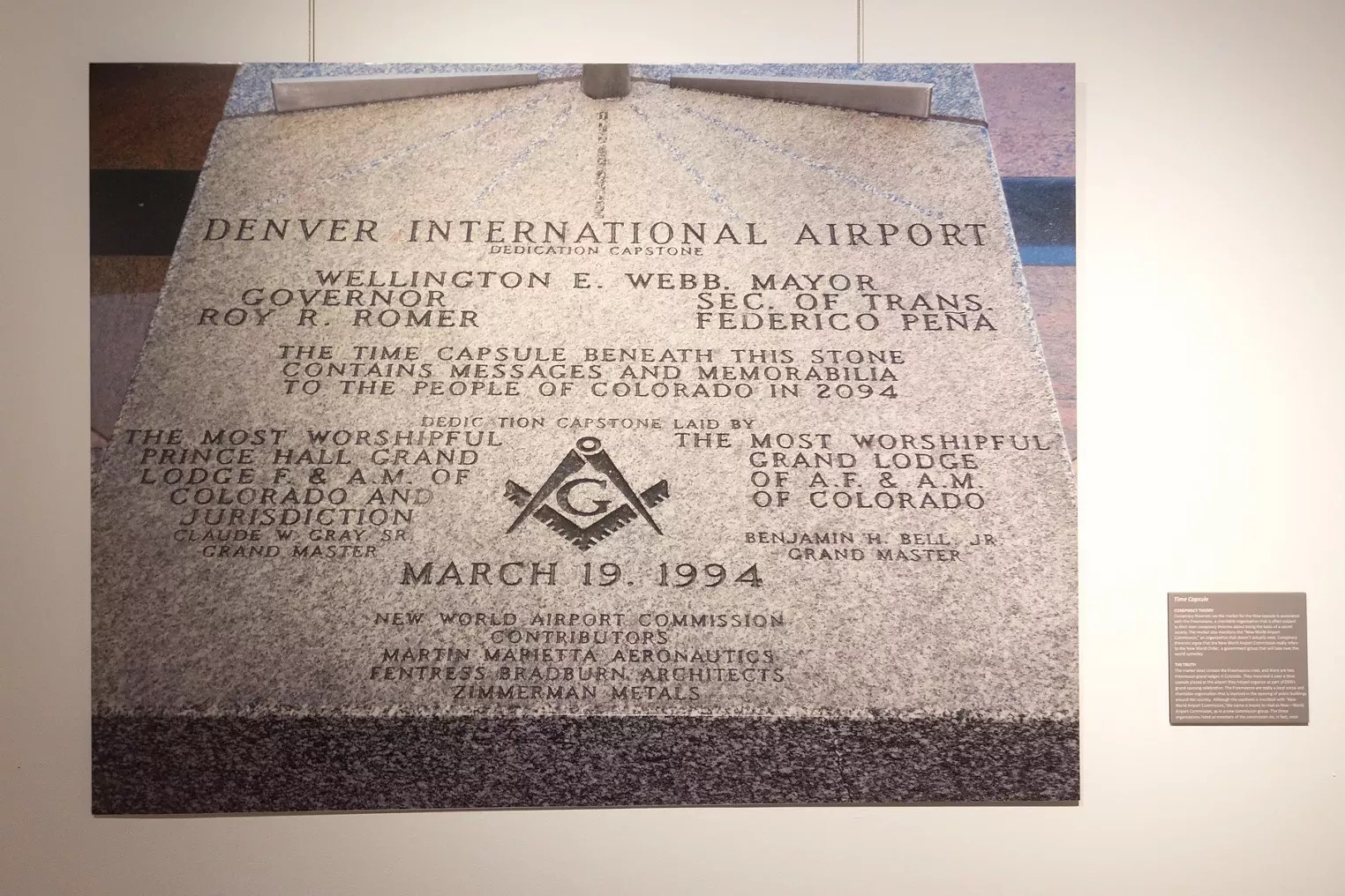 1. The capstone on a time capsule installed in the Great Hall, dedicated on March 19, 1994, cites the “New World Airport Commission” – which hosted opening celebrations for the airport before the place was anywhere close to opening. In reality, conspiracy kooks point out, that proves that the New World Order built the airport as a command center in its quest to establish a single, all-powerful global government. The Freemasons and Illuminati are in on it, too. “Denver is scheduled to be the Western headquarters of the US New World Order during martial law takeover,” David Icke wrote in his 1999 book, The Biggest Secret.