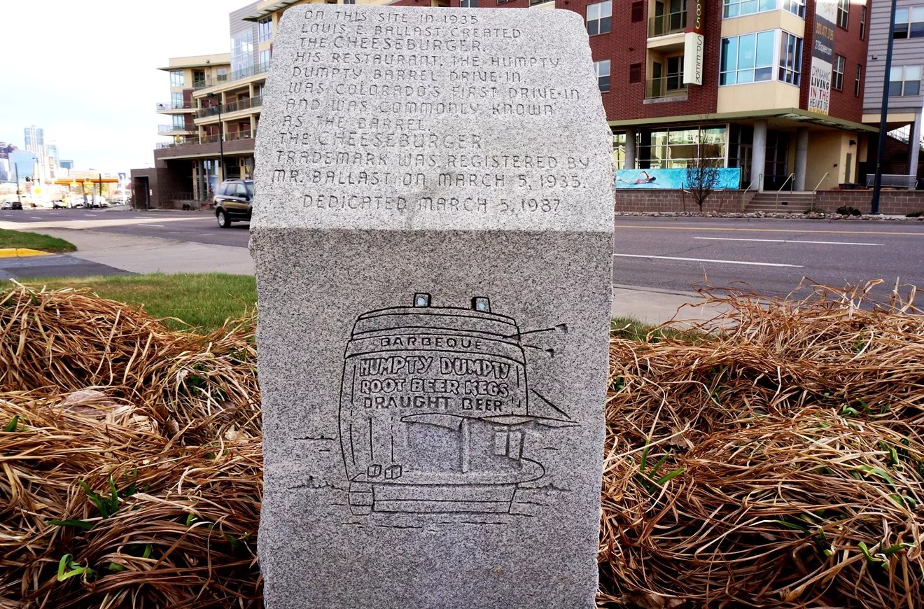 Louis Ballast, owner of the Humpty-Dumpty Barrel drive-in burger joint that was once located at 2776 Speer Boulevard, trademarked the word “cheeseburger” in 1935. Though the eatery itself is long gone, there’s a monument to Ballast and his drive-in (which he claimed was the first in Denver, too) at the site, now home to a Key Bank location.