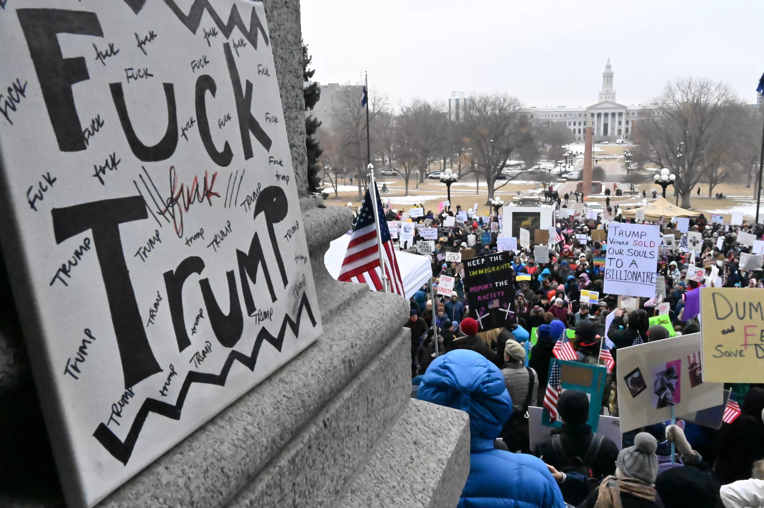 “Fuck Trump” was one of the most common phrases written on signs and chanted by protesters during Denver’s Presidents’ Day protest on February 17, which was a 50501 protest.