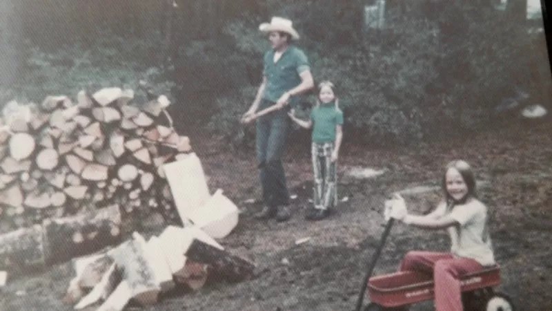 Kathy Sabine, in the wagon, with her dad and sister during her childhood in Truckee.