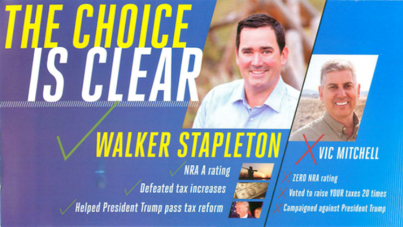At this writing, representatives from Stapleton’s campaign haven’t responded to our inquiries about the Next With Kyle Clark segment. When and if they do, we’ll update this post. But a new flier from Stapleton and company on view below boasts different wording about the Trump tax cuts; he’s said to have “helped” pass them as opposed to being the only state treasurer to give his blessing