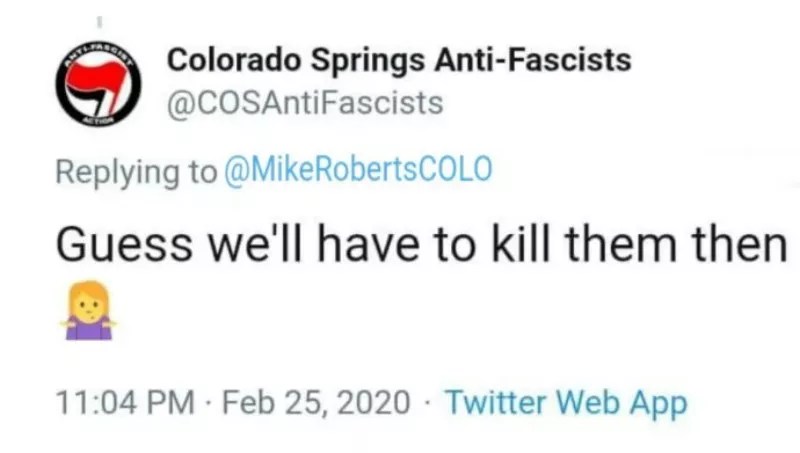 Hours after our publication of that piece came the first attack: “Westword‘s Robert Michaels Writes Hit Piece About Defend Denver,” with my name also reversed in the text. That’s now been corrected, although the error lingers in the URL. The central image was the following bogus tweet attributed to the Colorado Springs Anti-Fascists.