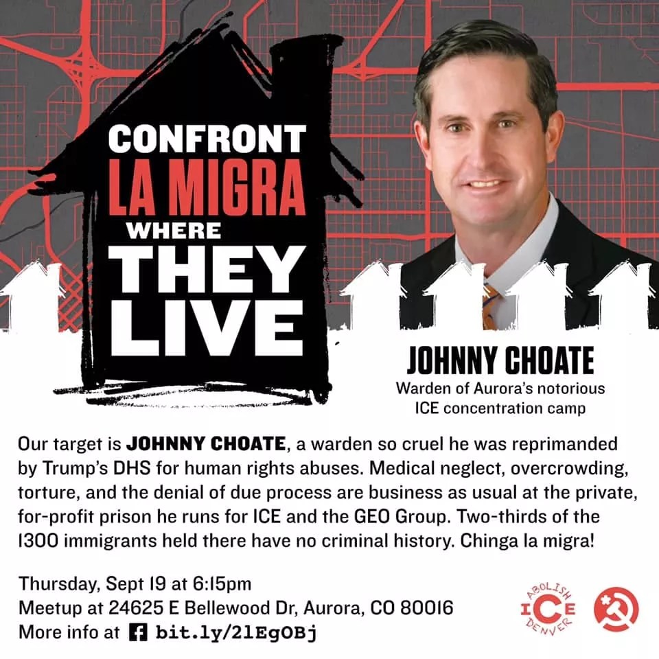 Abolish ICE Denver and the Denver Communists are organizing a protest outside the house of Johnny Choate, the warden of the immigrant detention facility in Aurora, on September 19.